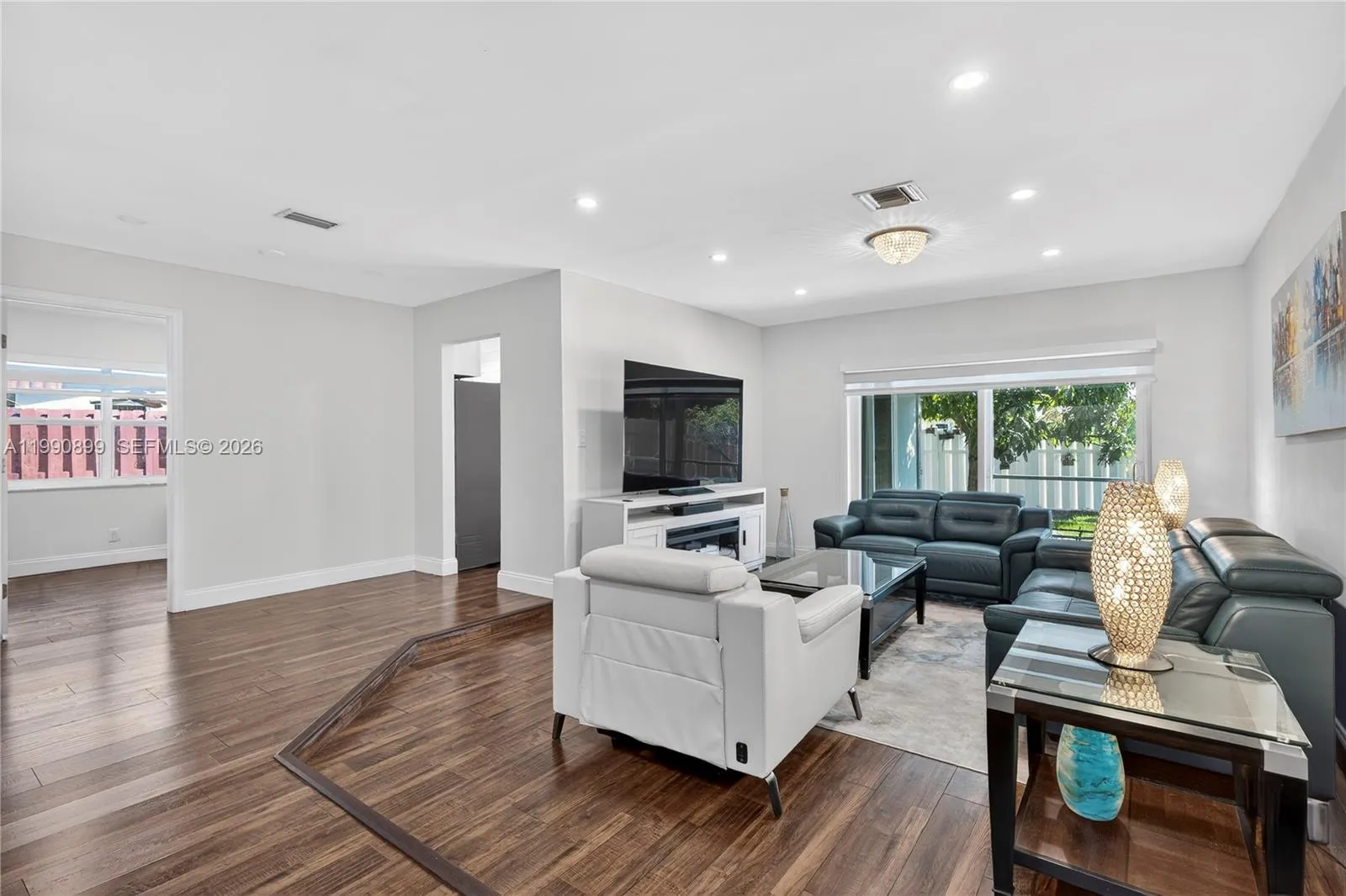 Beautiful 3-bedroom, 2-bath single home with an additional room that can be used as an office, den, or possible 4th bedroom. This move-in ready home features a remodeled kitchen with white cabinetry, quartz countertops, and stainless steel appliances, along with updated bathrooms. The home also includes impact windows and doors, new interior doors throughout, and modern zebra blinds. rnSpacious, fully fenced backyard with fruit trees, a screened-in patio, and a convenient storage shed for extra storage. The property includes a double-car garage, extended driveway for additional parking, irrigation system using well water, and municipal water and sewer. Interior and exterior have been recently painted. Conveniently located near shopping, dining, and major roadways.