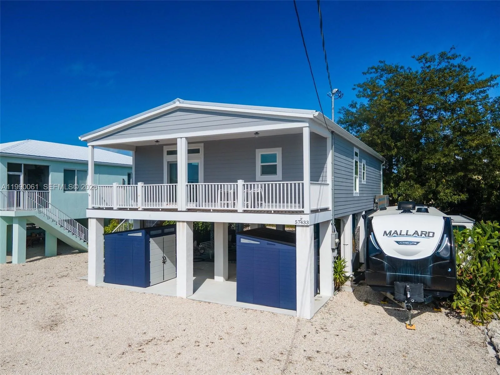 Experience refined coastal living in this elevated 2022 residence, where modern design meets effortless luxury. Featuring a durable metal roof and impact glass windows and doors, this home offers both peace of mind and sophisticated style. Inside, crown molding flows throughout an airy open-concept layout spanning 1,290 square feet under air. The chef-inspired kitchen is beautifully appointed with white quartz countertops, a custom center island with seating for four, and sleek, soft-close gray cabinetry. Premium Whirlpool stainless steel appliances, including a French-door refrigerator, range, built-in microwave, and dishwasher, are complemented by a beverage cooler and LG washer and dryer for ultimate convenience. This 3-bedroom, 2-bath retreat is thoughtfully designed for comfort and elegance. The spacious primary suite is filled with natural light and features a walk-in closet, double vanity with stainless finishes, a glass walk-in shower, accented by tiled backsplash details. Step outside to a covered porch and expansive under-home entertainment area, complete with a 6-person Jacuzzi, perfect for relaxing. The 6,000-square-foot lot, along with covered parking for four vehicles, two exterior storage units, a gutter system, and a cistern. A lush Calusa hedge surrounds the property, providing enhanced privacy and a serene tropical ambiance. A rare blend of elevated construction, high-end finishes, and inviting outdoor living-this exceptional property is ready to impress.