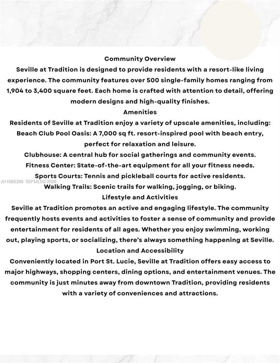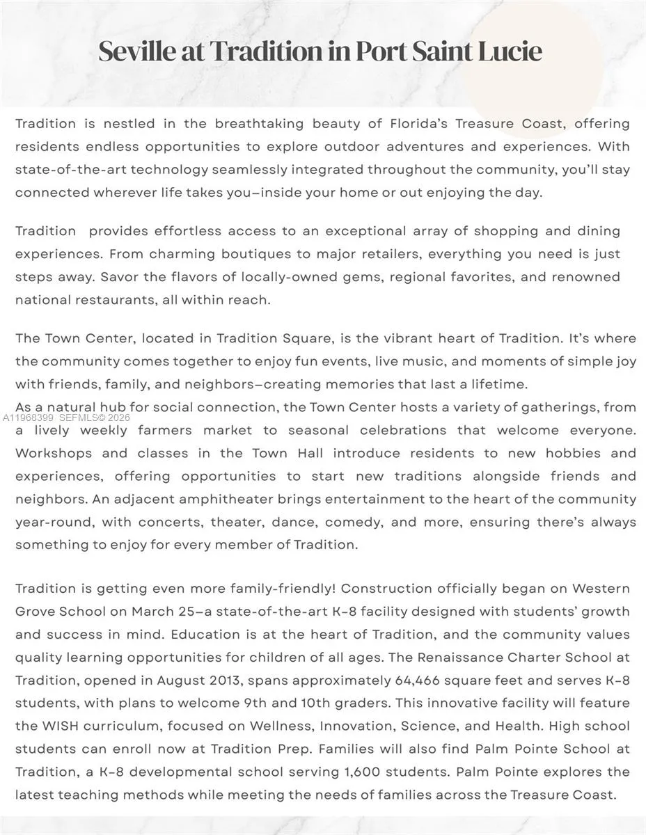 Experience refined lakefront living in Seville at Tradition by Mattamy Homes. This 2024 Noble model offers serene lake views and sophisticated indoor-outdoor living. Soaring ceilings, designer lighting, and open-concept living spaces create an elegant yet comfortable atmosphere. The gourmet kitchen flows seamlessly into the dining and living areas, all overlooking the water. Upgrades include built-in blinds, electric shades, surround sound in the office and main living areas, and a whole-home water softener system. The primary suite features mood lighting, dual vanities, separate closets, private water closet, and a floor-to-ceiling spa-style shower. Enjoy a fenced backyard with electric screened patio and customizable exterior lighting—perfect for entertaining. Residents enjoy resort-style amenities including clubhouse, resort pool, playground, event lawn, cabana area, fitness center, pickleball, basketball, walking trails, dog park, walking and golf cart paths. Most furniture/ golf cart are included. Seville is also located close to a variety of shopping, dining, and entertainment options. Residents will be w/minutes Of the St. Lucie West Town Center, the Tradition Town Center, the PGA Village. 10,000-sf clubhouse will provide the state-of-the-art fitness center, cycling studio, and social areas. Rest and relax in the 7,000-sf resort-style pool with beach entry & whirlpool spa with cabana seating. A great place to call home!