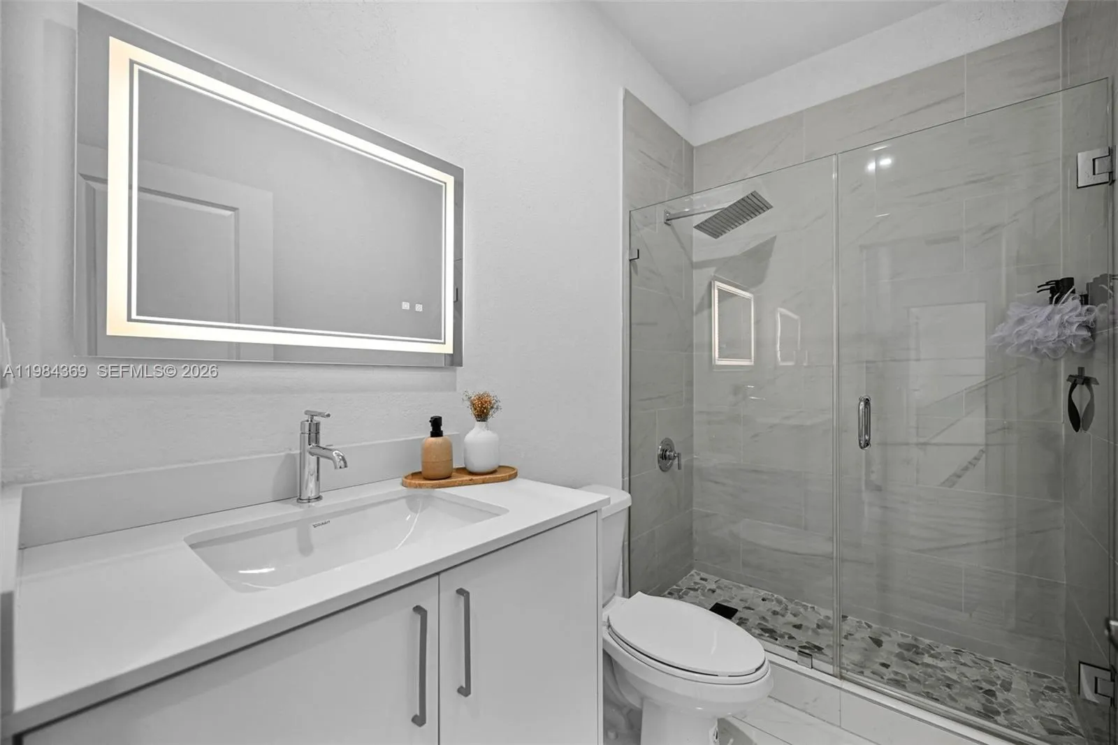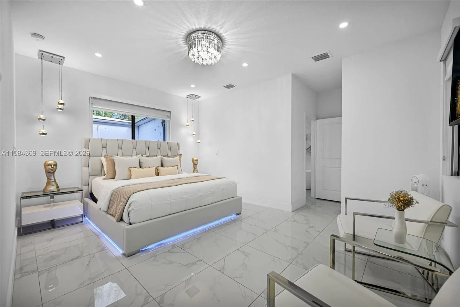 Modern luxury home, completely new and remodeled, situated on half an acre of private land. It features 5 spacious bedrooms and 4 bathrooms with high-end finishes.rnContemporary design with high ceilings, floor-to-ceiling windows, and open floor plan. Elegant kitchen with quartz island and modern appliances, seamlessly integrated with the living and dining areas. NO HOA.