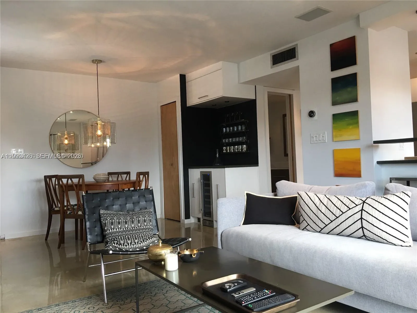 Fully Furnished Elegant Newly Renovated 1 bedroom 1 1/2 bath W/ GARAGE PARKING Fantastic Chef Kitchen All New Stainless Appliances Beautiful Polished Cement Floors New Washer and Dryer New Central AC Unit with WIFI connection. Surround sound throughout. Minutes from the Beach and Shopping. You Must See