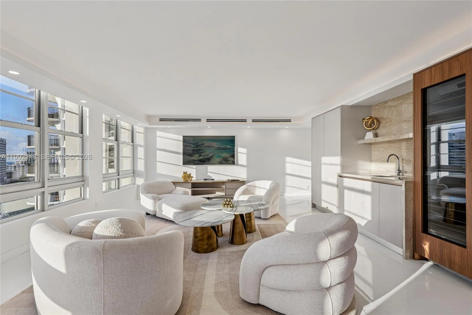 Exceptional opportunity to own a totally renovated move-in-ready, luxury condo featuring direct ocean views. Located in exclusive, 89-unit waterfront building, this self-managed property is 100% owner-occupied with no rentals allowed, ensuring the highest standards of privacy and security. Notably, the 40-year recertification has been completed, and all special assessments have been fully paid by the seller. The interior has been completely renovated with new impact windows and door and is offered fully furnished with brand new high-end pieces from the Eichholtz Gallery. The Italian design kitchen includes an amazing island with state-of-the-art Miele Diamond appliances, including a separate Master Cool refrigerator and freezer, induction cooktop, handleless speed ovens with a warming drawer. The bar area features a built-in Master wine cooler and an M Touch Miele coffee maker, all complemented by custom cabinet. The spa-like master bath includes a separate toilet room and a free-standing Kohler CERIC bathtub with a floor-mount bath filler and hand shower. All closets feature custom cabinetry and lighting, while all windows are equipped with motorized shades and blackouts in the bedrooms. Every room is equipped with custom lighting and brand-new Samsung Frame-Pro Vision AI television. The launder room includes new LG washer and dryer and custom cabinetry with sink. This is a rare chance to acquire a luxury property of this caliber at a great value.