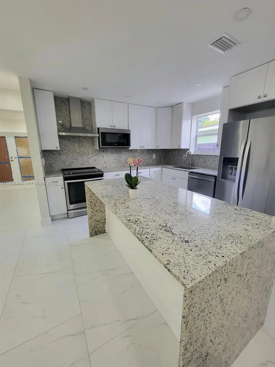 Spacious single family home with 5 bedrooms and 3 bathrooms. Fully renovated a year ago. All impact windows & doors, custom kitchen with island and bar seating, granite countertops, and phone charging stations. Tankless water heater, stainless steel appliances, stacked full-size washer & dryer. Custom kitchen cabinets & backsplash. Modern bathrooms with frameless shower doors and white Venetian porcelain tiling. Newer AC with nest smart thermostat. HUGE backyard with 24 ft x 48 ft patio, pergola covering and giant ceiling fan—perfect for entertaining and those BBQ nights! Schedule your private showing asap and fall in love with your new home in the heart of Pembroke Pines.