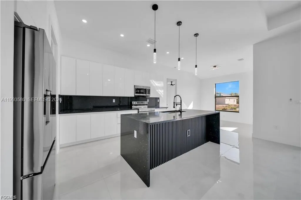 Modern home featuring high ceilings, underground electricity, and pre-installed electrical and plumbing connections in the garage for future use. Includes washer and dryer and exclusive black quartz countertops on the kitchen island and all bathrooms. Impact-resistant doors and windows throughout, including the master bedroom and garage, provide safety and peace of mind. The home offers a spacious den, large office, a bright open kitchen and living area, and contemporary shower systems. Additional features include a modern rain gutter system, wide entry with short hallway, and a full sprinkler system. Located in a rapidly growing residential neighborhood surrounded by new constructions, this home combines style, functionality, and comfort in one of the most desirable areas of the city.