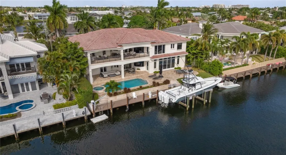 Welcome to the ultimate boater’s estate in Lighthouse Point. Situated on a prestigious cul-de-sac, this Mediterranean residence sits on a massive turning basin, offering expansive water views and effortless maneuverability for large vessels. The property features 100 feet of water frontage with no setbacks and a brand new 32,000 lb Hurricane boat lift.rnrnEnter through double doors to soaring ceilings, travertine flooring, and water views from the moment you step inside. The floor plan is designed for multi-generational luxury, featuring a residential elevator and dual laundry centers (upstairs and down). The kitchen was recently refreshed with new quartz countertops, opening to a spacious family room. The first floor hosts two guest suites, including a VIP suite with a fully remodeled 2024 ensuite bath and walk-out pool access.rnrnUpstairs, discover a dedicated executive office, a remodeled morning bar/coffee lounge, and a gym (or additional bedroom) with a private balcony. The exterior is an entertainer’s paradise featuring a sprawling covered loggia, summer kitchen, heated pool, and spa. Recent Upgrades: Full-home Generac generator, impact windows/doors, 1 new A/C unit (2025), new landscaping, 3-Car Garage. Unbeatable value on a street with neighboring $10M+ estates.