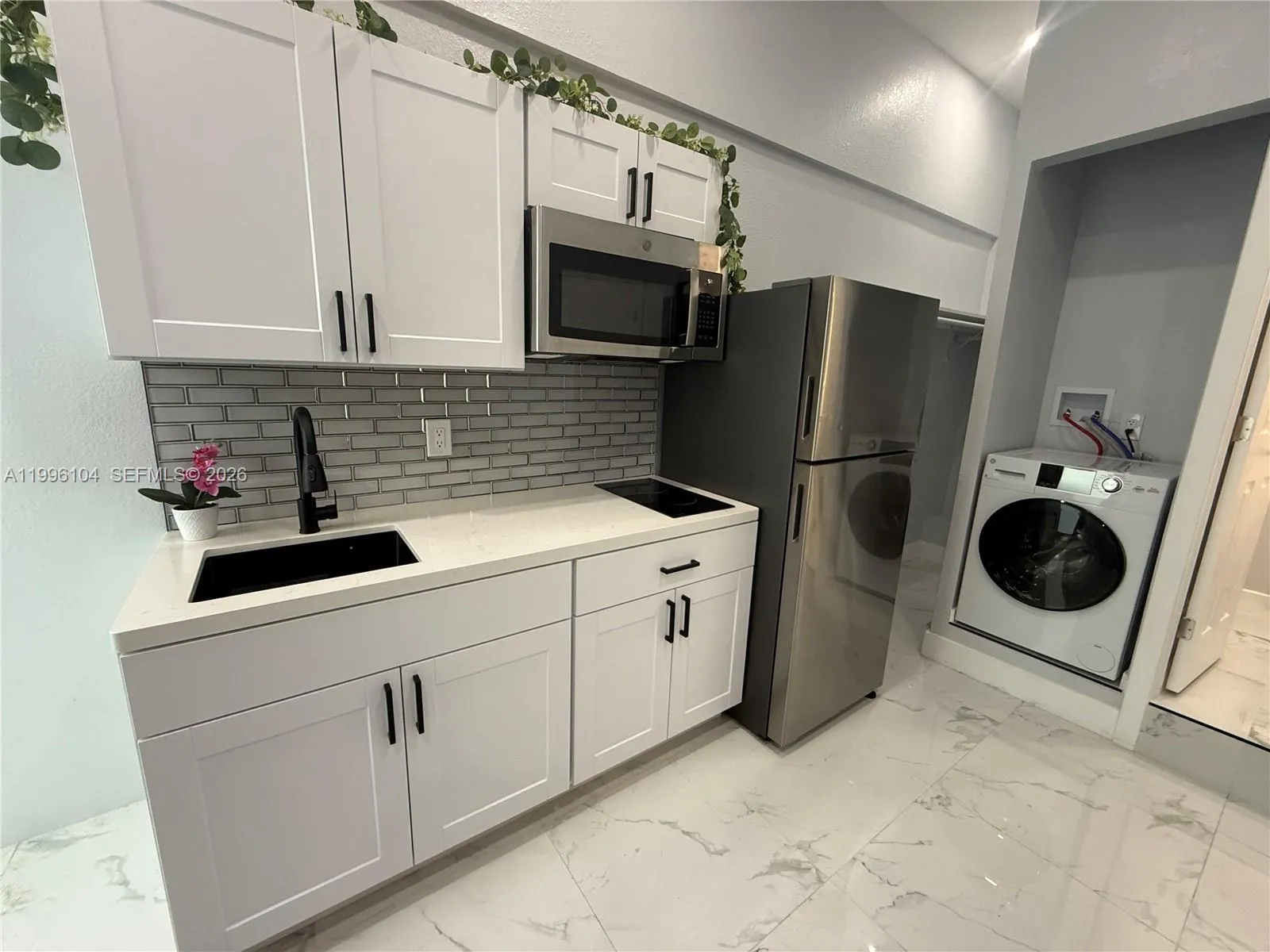 Newly remodeled, Furnished studio unit for one person featuring an in-unit washer and dryer.