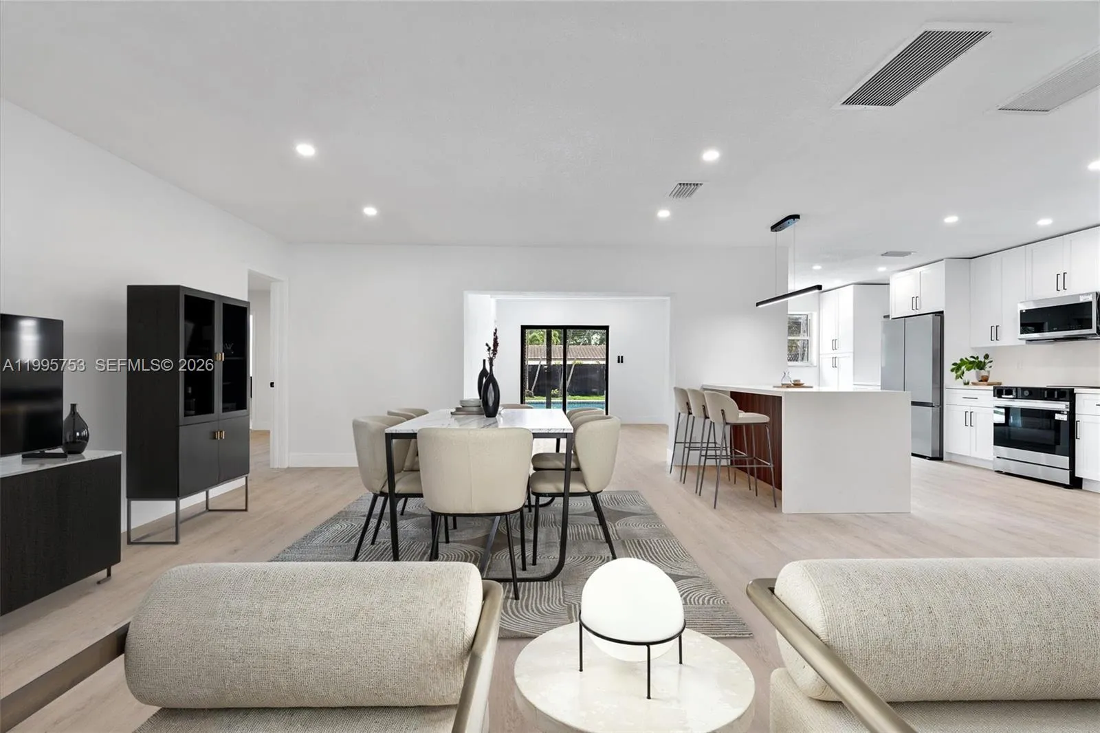 Welcome to this beautifully refreshed single-family home in the peaceful Sunset Isles community. This four-bedroom, three-bathroom residence has been thoughtfully updated to provide a modern, comfortable living experience. Head inside to discover brand-new vinyl flooring that flows throughout an expansive, open-concept layout designed for effortless movement. The heart of the home is the stunning new kitchen, featuring sleek cabinetry, quartz countertops, and a full suite of new appliances. Every inch feels fresh with new interior and exterior paint, upgraded lighting, and fully renovated bathrooms. Peace of mind comes standard with a new AC system, a new driveway, and a repaired irrigation system keeping the fresh sod and landscaping vibrant. Outside, the renovated pool area serves as a private oasis, backed by a convenient service road for added seclusion. This fenced property truly offers room to breathe. Mortgage savings may be available for buyers of this listing.