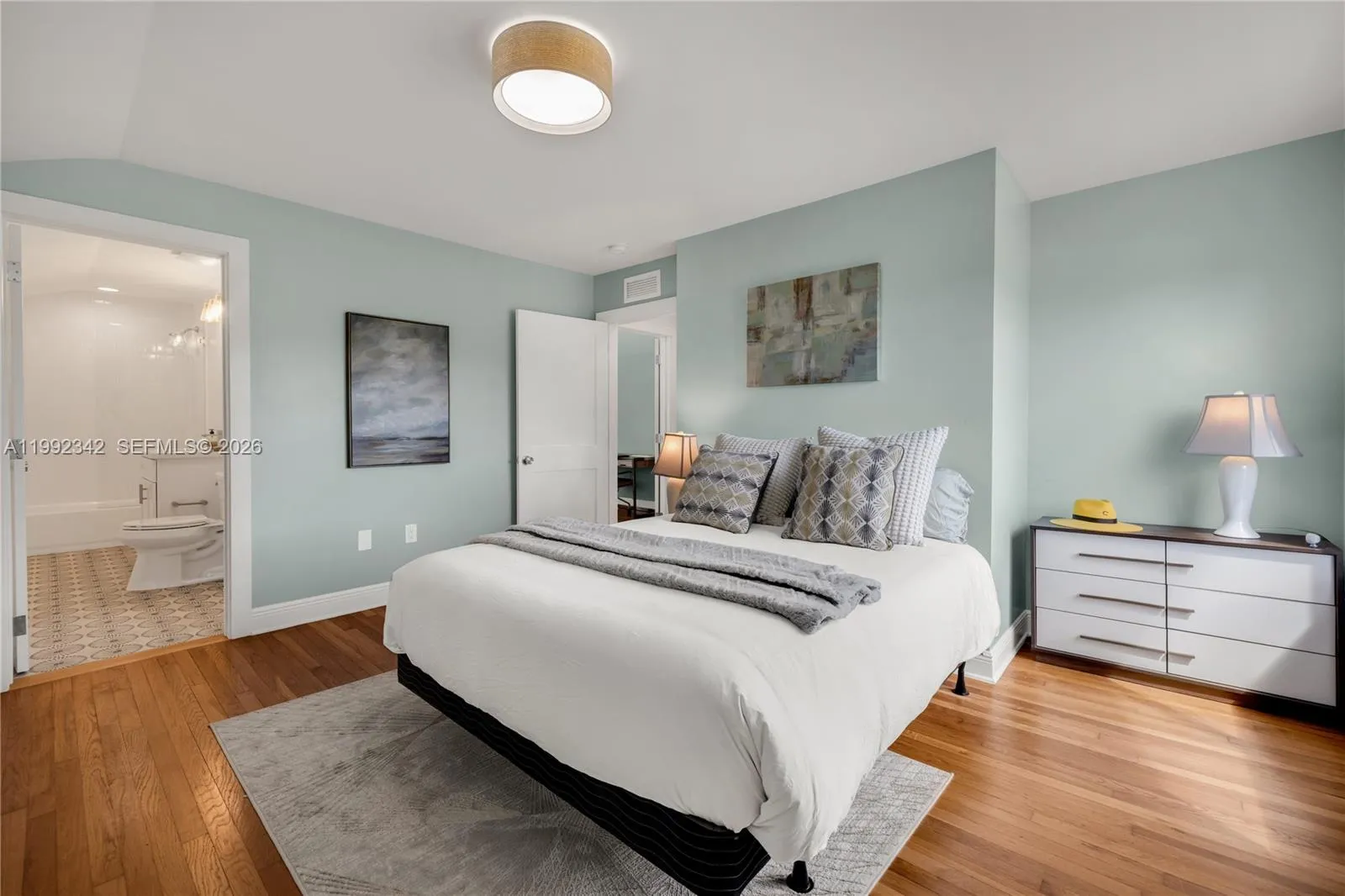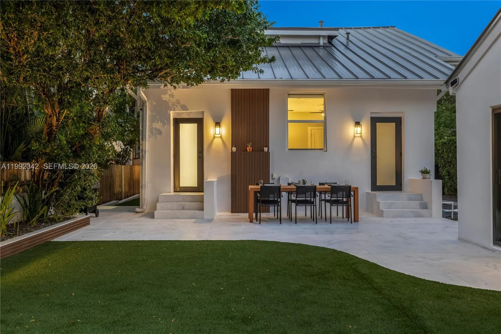 This one is special! Introducing Le Château, a fully reimagined 1925 estate in the lush enclave of El Portal—where historic architecture meets curated modern living. This rare offering includes a 4-bedroom, 3-bath main residence plus a detached 1-bedroom, 1-bath guest house, totaling 5 bedrooms and 4 baths across 3,300+ SF. A gracious front porch opens to grand interiors with soaring 10-foot ceilings, layered plasterwork, sculptural coffered details, and museum-quality crown moldings. Restored hardwood floors run throughout, anchored by a marble fireplace, with custom built-ins and a formal dining room creating an elegant yet inviting setting. The redesigned kitchen blends clean modern finishes with functionality while honoring the home’s architectural soul. The main level features a spa-like primary ensuite and an additional guest bedroom with full bath. Upstairs offers two bedrooms, a shared bath, and a charming loft retreat. Thoughtfully upgraded with impact windows and doors, metal roof, electrical, plumbing, and HVAC—this is a true turnkey residence. Outdoors, marble-clad patios and manicured grounds create a private setting with room for a pool. The detached guest house offers flexibility for guests, office, or income. Set beneath a majestic oak canopy in a non-flood zone on one of El Portal’s most picturesque streets—there is truly nothing else like it.