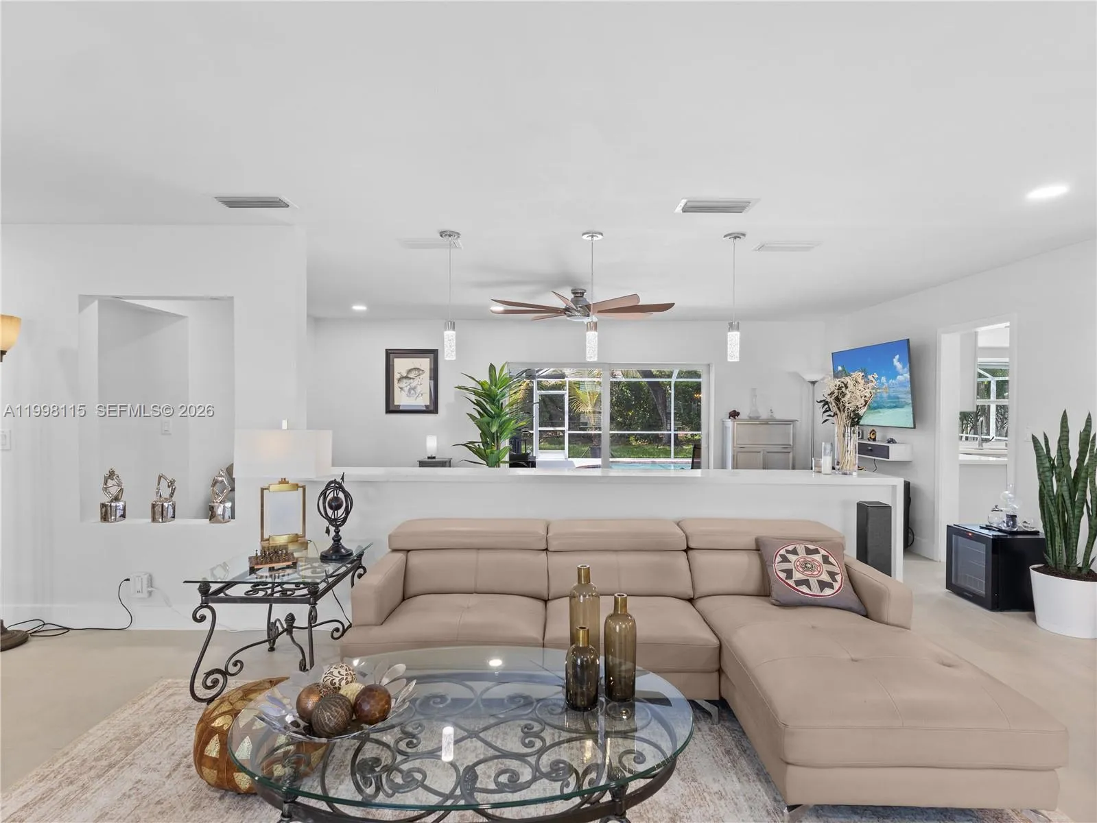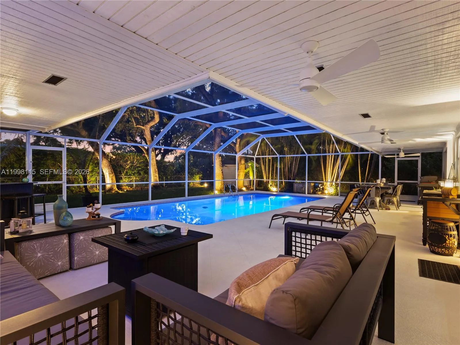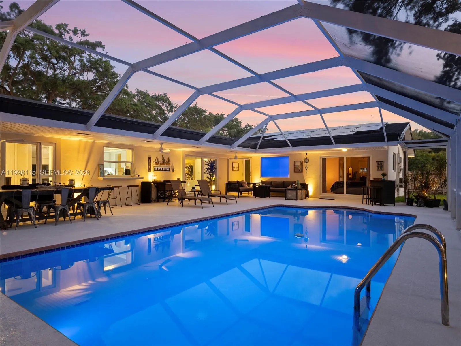 Fully Renovated Palmetto Bay Retreat | Designer Finishes | Resort-Style Pool & Outdoor Living. Experience refined South Florida living in this fully renovated residence located in the heart of Palmetto Bay. Thoughtfully redesigned with a focus on modern elegance, comfort, and functionality, this home offers a seamless blend of indoor sophistication and outdoor lifestyle. From the moment you arrive, the property stands out with its clean architectural lines, updated exterior, and striking evening presence. Inside, expansive living areas flow effortlessly, enhanced by new flooring throughout, abundant natural light, and a warm contemporary aesthetic. The kitchen has been tastefully remodeled with modern finishes, sleek cabinetry, and an open layout ideal for both everyday living and entertaining. Multiple living areas provide flexibility for hosting, relaxing, and family life. The primary suite offers a private retreat with a fully updated bathroom featuring spa-inspired design and high-end finishes.rnThe outdoor space is a true highlight. The covered terrace and screened pool enclosure create a private, resort-style setting, complemented by custom landscape lighting and mature greenery—perfect for both quiet evenings and entertaining guests. New Roof 2026, Full Impact Windows & Doors, Turn Key/Move in Ready, Large Lot (17,000 SQ FT), No HOA.