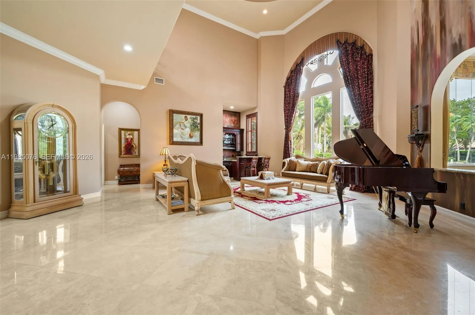 Luxury estate home in prestigious Stonebrook Estates offering over 6,540 sq ft of living space on a private 42,000+ sq ft lot. This 6-bedroom, 7.5-bath residence affords a well-designed floor plan with a spacious primary suite on the main level, den and a luxurious bathroom with a Roman tub, oversized shower, & dual water closets. Large windows thru-out fill the home with abundant natural light. The open-concept kitchen features a Sub-Zero refrigerator/freezer, double oven w/warmer, and flows seamlessly into the dining area and family room. Saturnia marble flooring, solid wood interior doors, and French doors add to the home’s elegance. Designed for both comfort and entertaining, the main level also includes a media room w/new leather power recliners, half bath and an en-suite guest bedroom providing privacy for visitors. The second floor offers four bedrooms, each with en-suite baths, along with a spacious loft. Dual laundry rooms on both levels add convenience. Outdoor living includes a covered patio w/471 sq ft), resort-style pool and spa, and a private backyard with a full working summer kitchen. Other features include impact windows and doors, full wet bar with refrigerator & ice maker, central vacuum, Updates include two water heaters (2021), three A/C units (all under 5 years old), and a roof replaced in 2017. Four-car garage w/split design. Community offers 24-hour manned gate, tennis/pickleball/basketball/volleyball courts, fitness center & clubhouse.