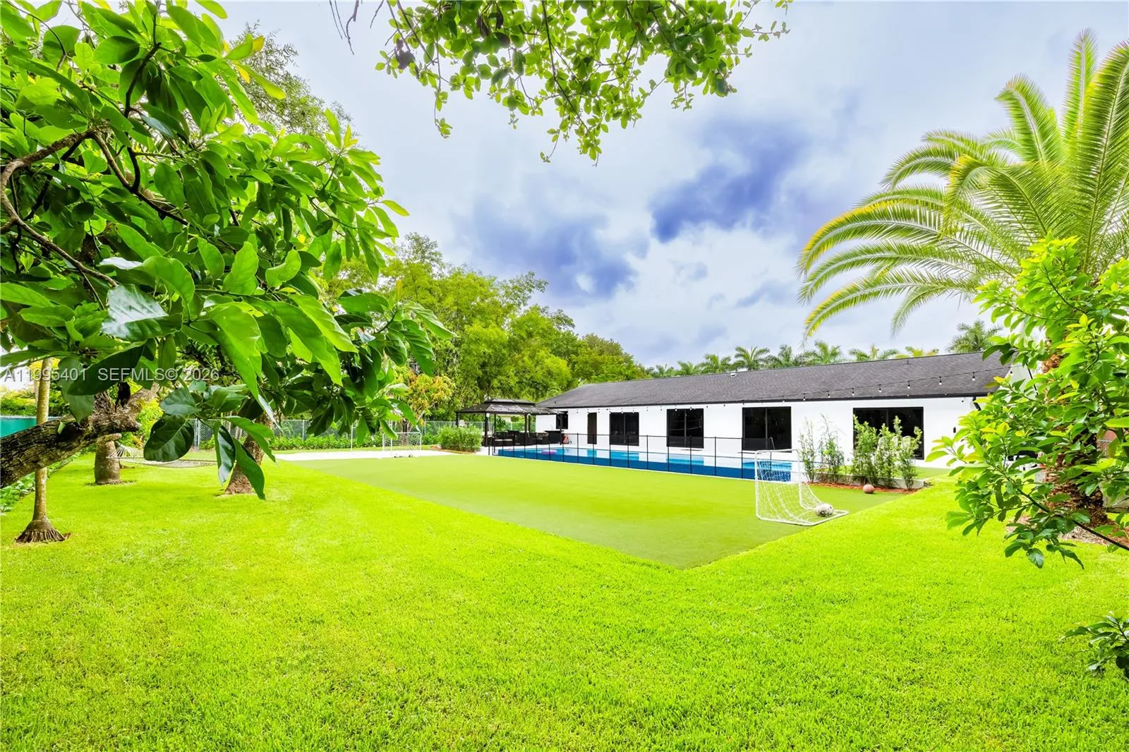 The house features bathrooms and a kitchen that were completely remodeled in 2024. Also added in 2024 was a 50-foot by 18-foot infinity-edge pool, equipped with a heater, a saltwater system, and full automation. The property boasts a synthetic-turf soccer field and a sandy beach volleyball area. The lot spans nearly an acre and is divided by a fence into two sections—each with its own independent entrance—making the undeveloped portion ideal for a business venture or for building a guest house. The driveway features a covered canopy tall enough to shelter a boat or an RV. The home is served by well water and includes a two-car garage. Currently, the property operates as an Airbnb rental; it comes fully furnished and equipped, allowing a new owner to seamlessly continue the business—a process currently managed by a dedicated administrator. The entire operational infrastructure is already in place to ensure the business continues without interruption; we can provide Airbnb financial statements so prospective buyers can review the revenue figures. The roof and air conditioning system were already installed when we purchased the property in 2021, though they were relatively new at the time. This residence offers spacious interior and exterior living areas, featuring beautiful garden spaces with tremendous potential for a wide variety of uses.