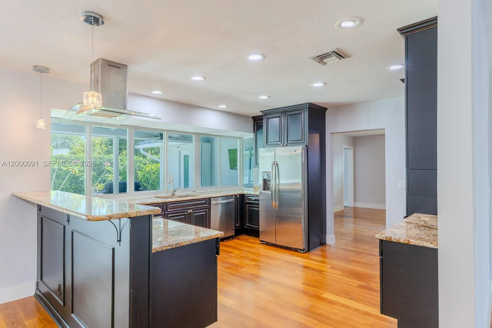 Beautifully updated 4-bedroom, 3-bath single-story home offering 2,288 SF of move-in ready living in a quiet, desirable neighborhood just 5 miles from the beach. This home features a circular driveway, 2-car garage, and a 2021 metal roof with 2023 central air for peace of mind. Inside, enjoy a bright open-concept floor plan with rich wood floors, recessed lighting, and a spacious living area filled with natural light. The upgraded kitchen boasts granite countertops, stainless steel appliances, and a snack-bar counter perfect for entertaining. A formal dining room adds elegance, while two master suites provide flexible living options. Additional highlights include impact windows, plantation shutters, zebra blinds, and ample storage. Step outside to a 350 SF screened-in patio with travertine floors plus an additional open patio—ideal for relaxing or hosting. Conveniently located near top-rated schools, hospital, and just 7 miles to Fort Lauderdale-Hollywood International Airport.