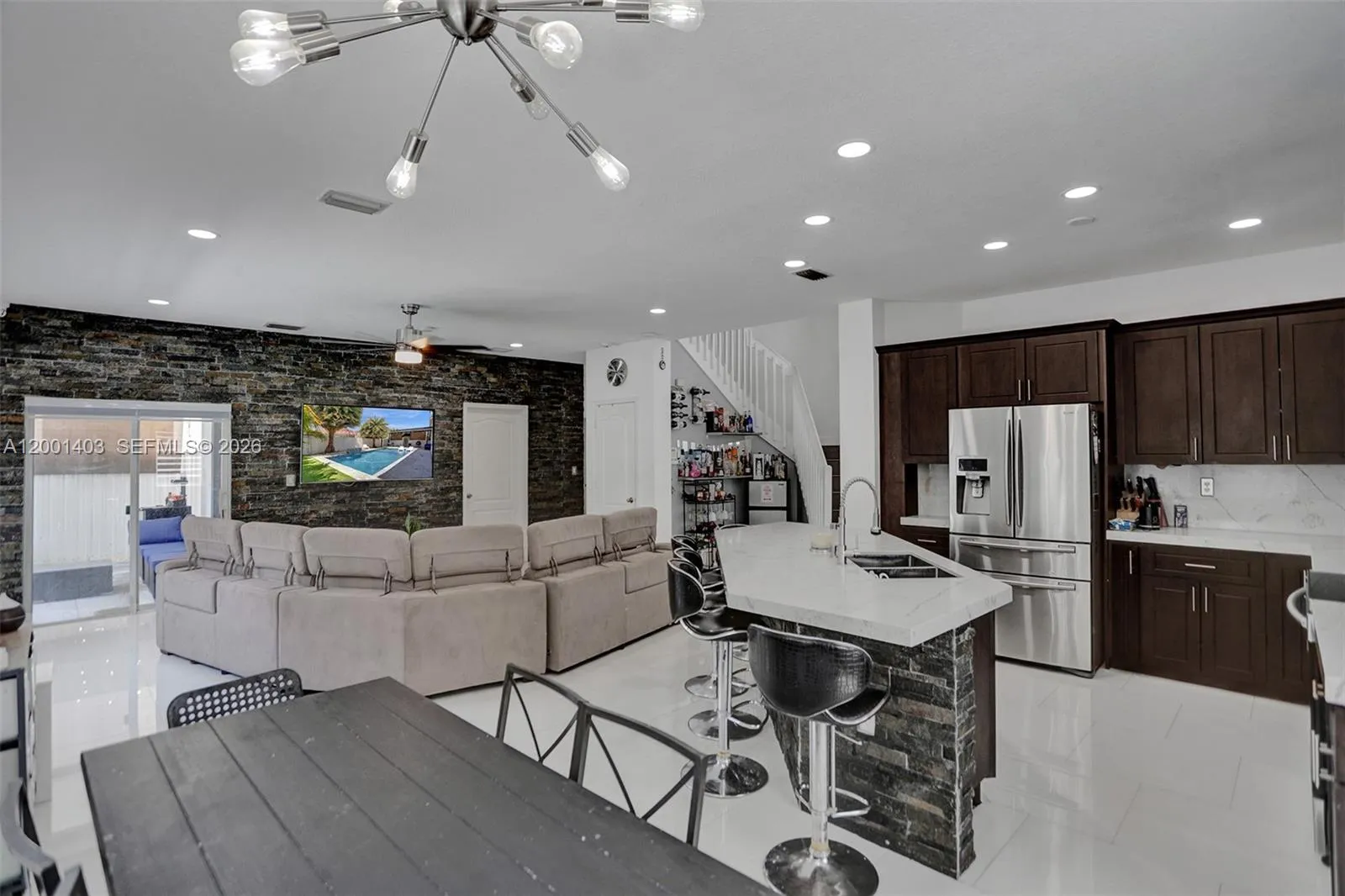 NO HOA. Beautifully remodeled two-story residence offering 4 bedrooms and 3 bathrooms, blending modern design with comfortable living. This move-in-ready home features a sleek updated kitchen with stainless steel appliances, upgraded tile flooring, and bright, open spaces throughout. The backyard is designed for both relaxation and entertaining, complete with a saltwater heated pool with jacuzzi and a covered pergola lounge with TV. An expansive paver driveway adds to the home’s strong curb appeal while providing ample parking. A well-balanced home with quality upgrades and inviting indoor-outdoor living.