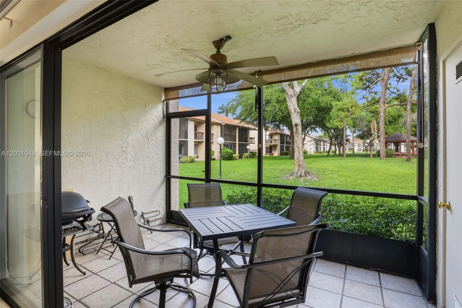 Beautifully updated and meticulously maintained first-floor residence offering a rare open concept layout. The kitchen wall has been removed to create a seamless flow between the kitchen and living area, perfect for everyday living and entertaining. The kitchen and both bathrooms have been tastefully renovated with quality finishes throughout. Enjoy a private screened-in enclosure overlooking a peaceful green courtyard making it ideal for relaxing in a quiet setting at any time of the day. Conveniently located near the entrance of the community, within walking distance to the clubhouse and boasting the first parking space next to the walkway, this unit offers both accessibility and convenience. Additional highlights include individual valve shutoffs throughout the unit at every water source, newer washer/dryer, and a roof that is less than 3 years old. The new roof combined with the recently passed 40-year inspection combine for optimal insurance savings for all unit owners. This association is extremely well funded and has never had a special assessment! Situated less than ten minutes from I95 and the Florida Turnpike, this is truly a turnkey residence that perfectly combines comfort, style, and an unbeatable location.