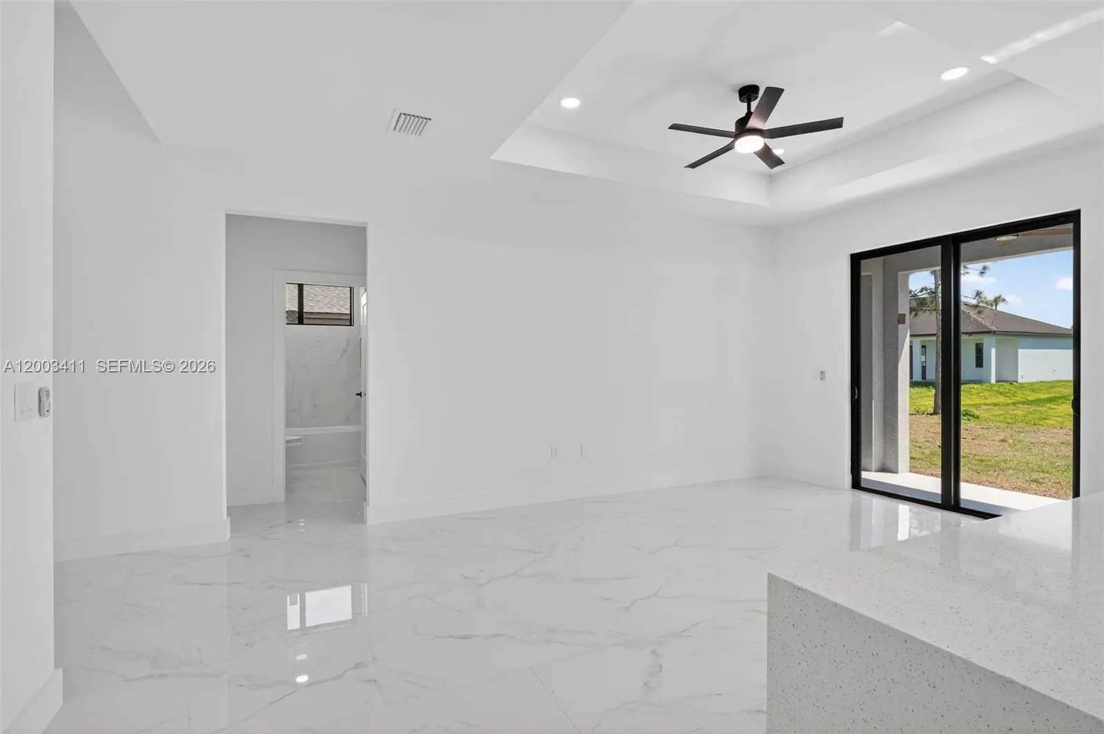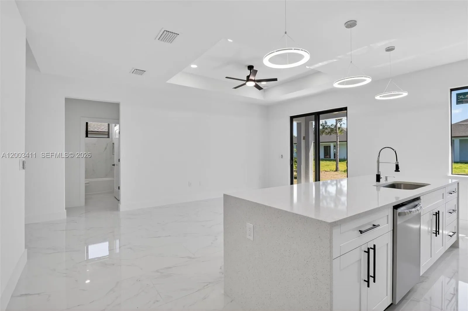 New-construction home in Lehigh Acres, FL: 3 bedrooms + den, 2 full baths. Open-concept living with abundant natural light and ceramic tile flooring throughout. Kitchen with stainless-steel appliances, stone countertops and center island; buyer may select final interior finishes and color palette. Spacious master suite with walk-in closet and dual-sink vanity. Energy-efficient windows, hurricane-rated doors and attached 2-car garage. Convenient to shopping, dining and major roadways. Ready for buyer personalization — inquire about upgrade allowances and timeline.