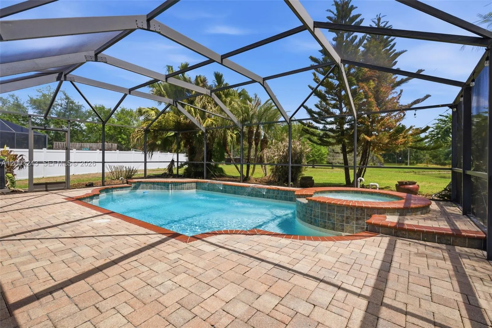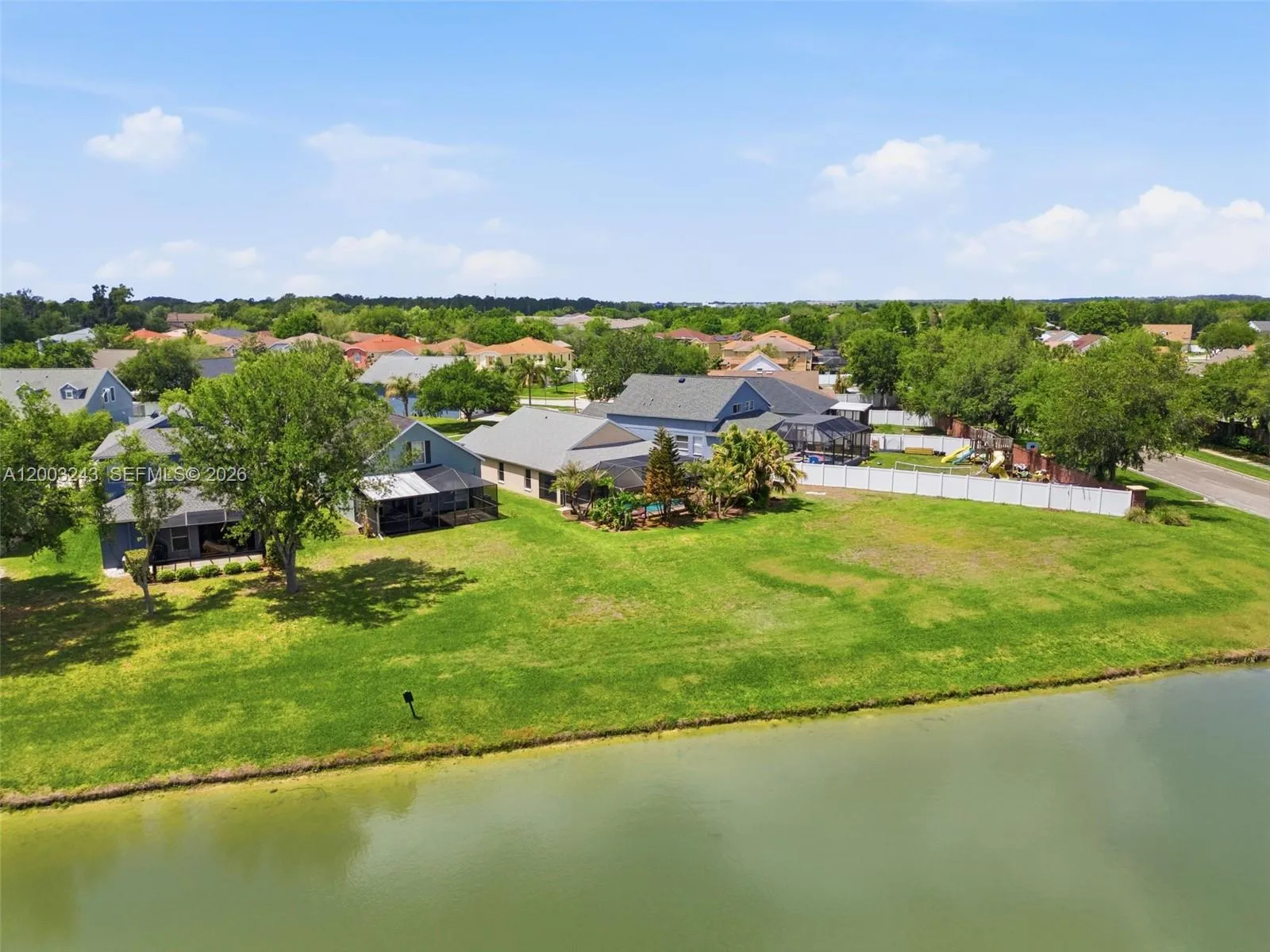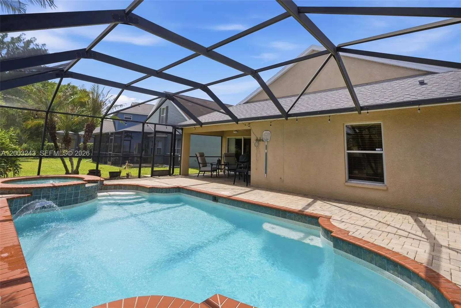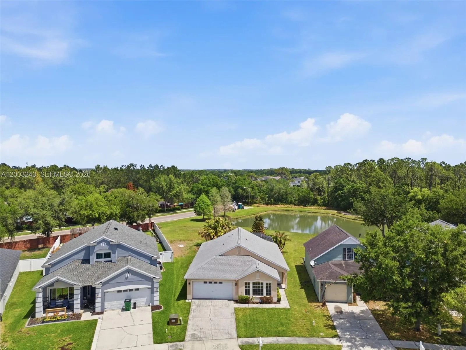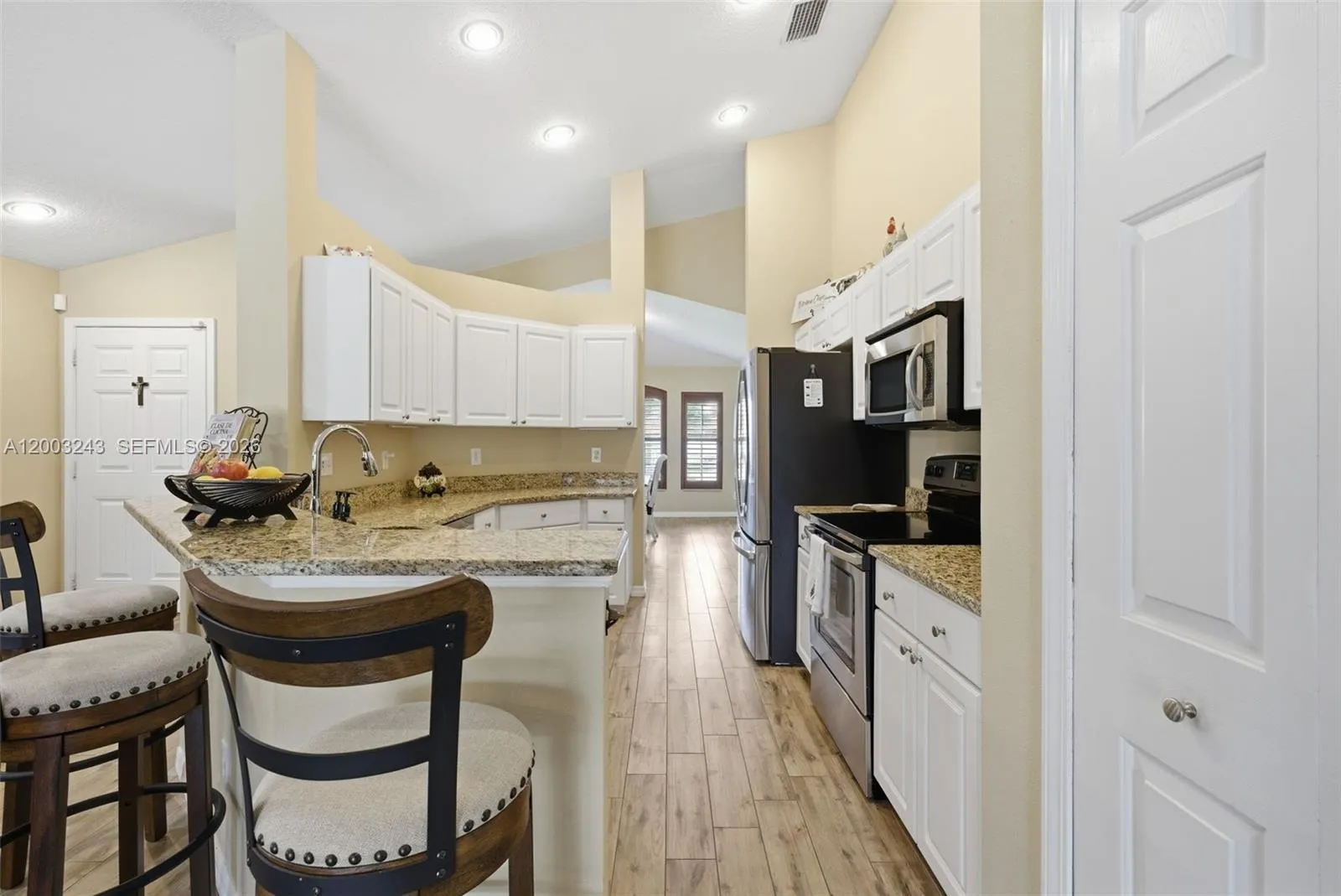 Welcome to this stunning 3 bed/2 bath one story, move-in ready home in the highly sought-after New River Lakes community. The home has vaulted ceilings and an open-concept layout that creates a bright, airy feel. The fully equipped kitchen features bar seating, granite countertops, a pantry, and stainless-steel appliances. Wood-look tile and laminate flooring throughout adds a modern and elegant touch. The primary suite has vaulted ceilings, walk-in closet and updated master bath featuring beautiful modern finishes. Roof replaced in 2022 and an HVAC system updated in 2024. Outdoor living is just as impressive, with an extended covered patio and screened-in pool and spa overlooking a serene pond and conservation area. Residents enjoy no CDD fees and a low HOA that includes cable and internet, along with access to community pool, playgrounds, tennis courts, and basketball. Great location with easy access to I-75, Wiregrass Mall, Tampa Premium Outlets, dining and entertainment. Call today to Schedule your private showing and experience all it has to offer!