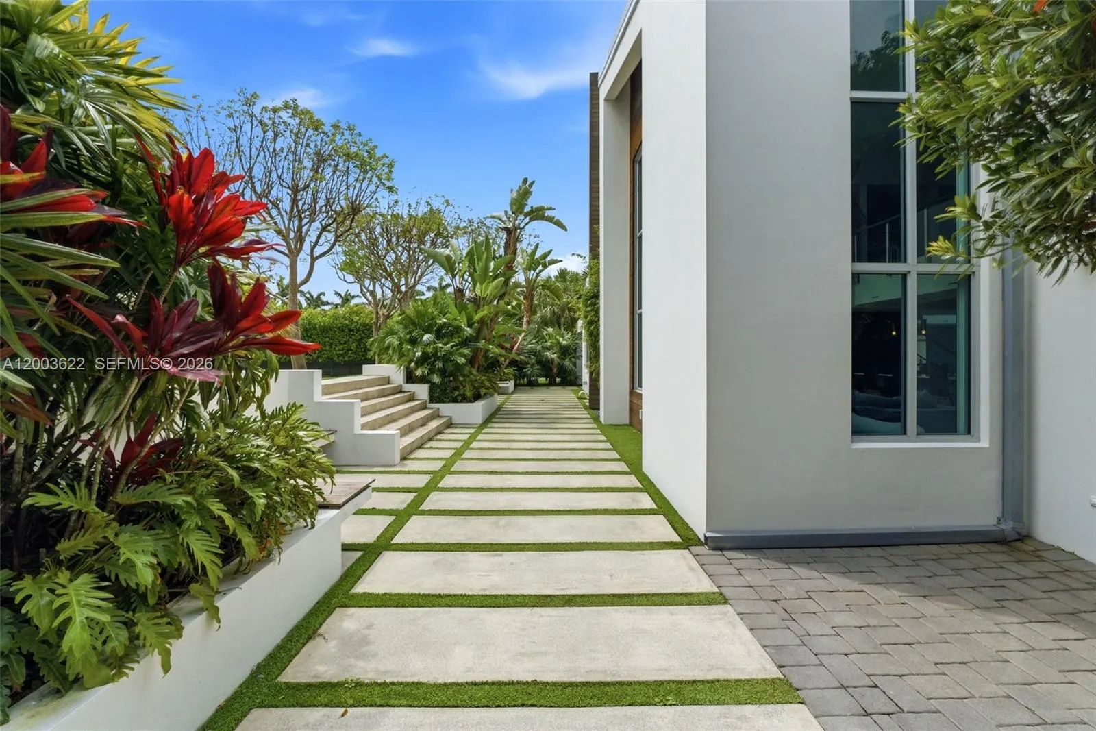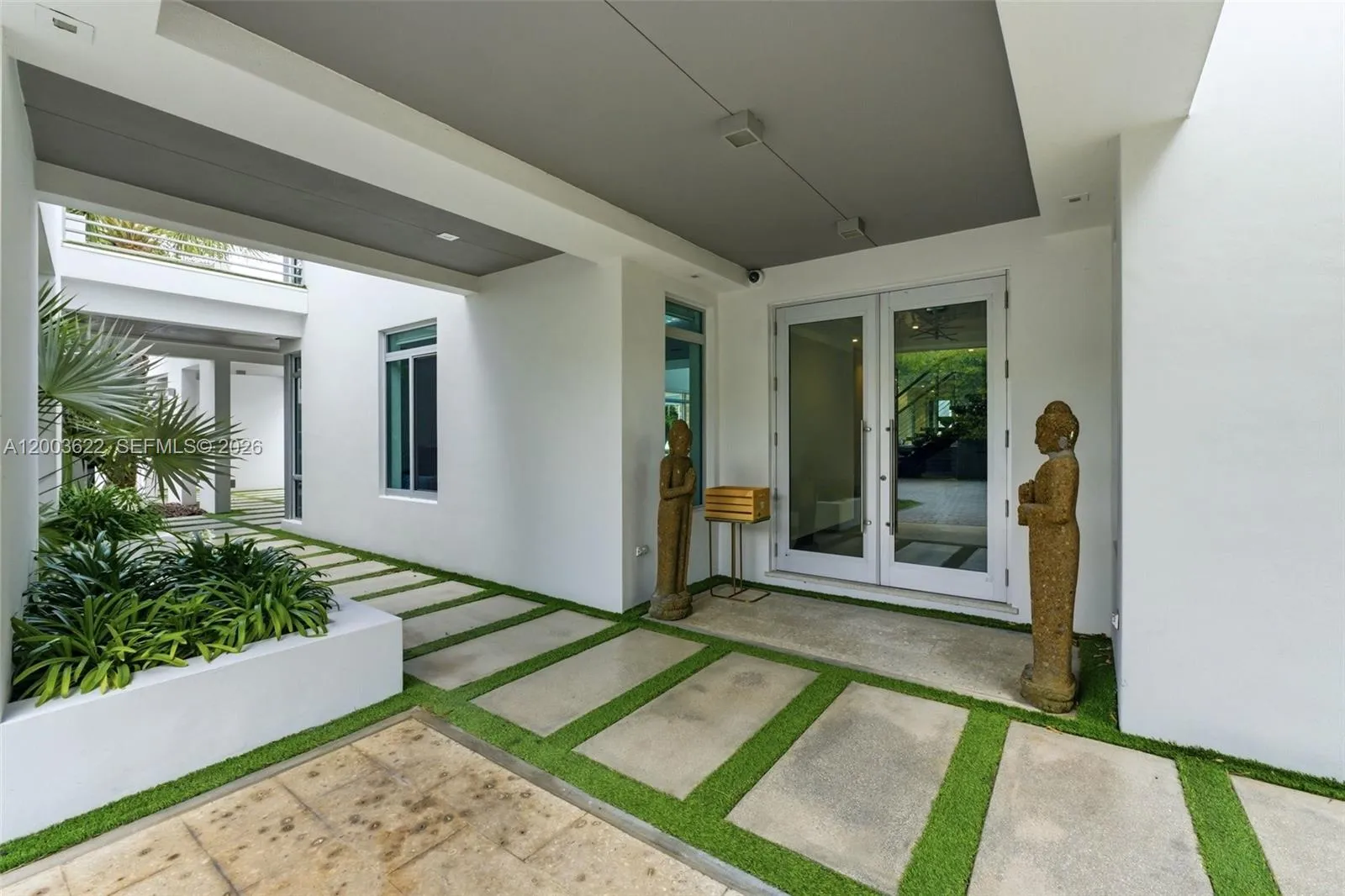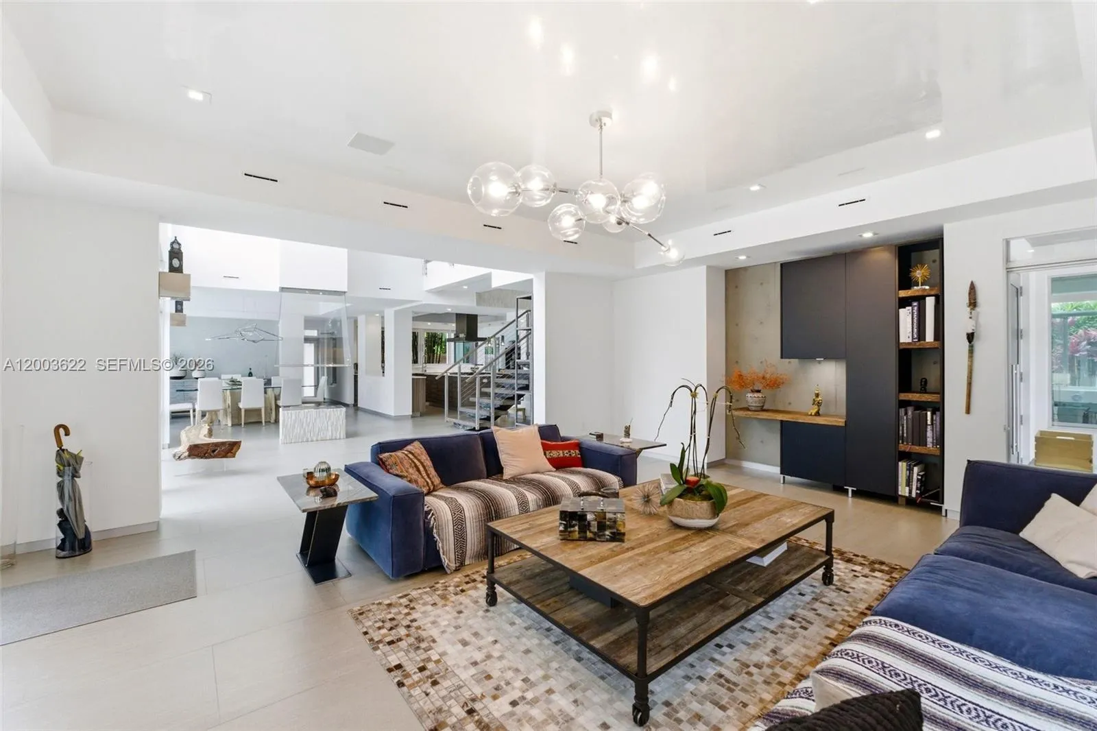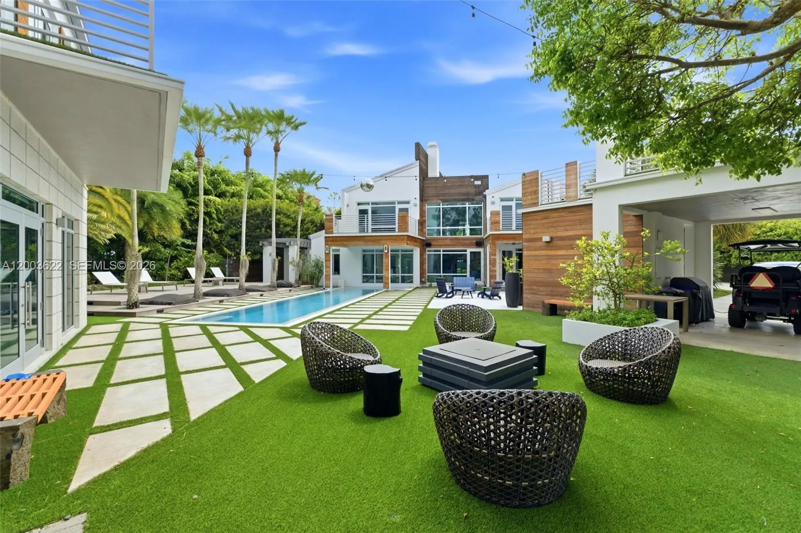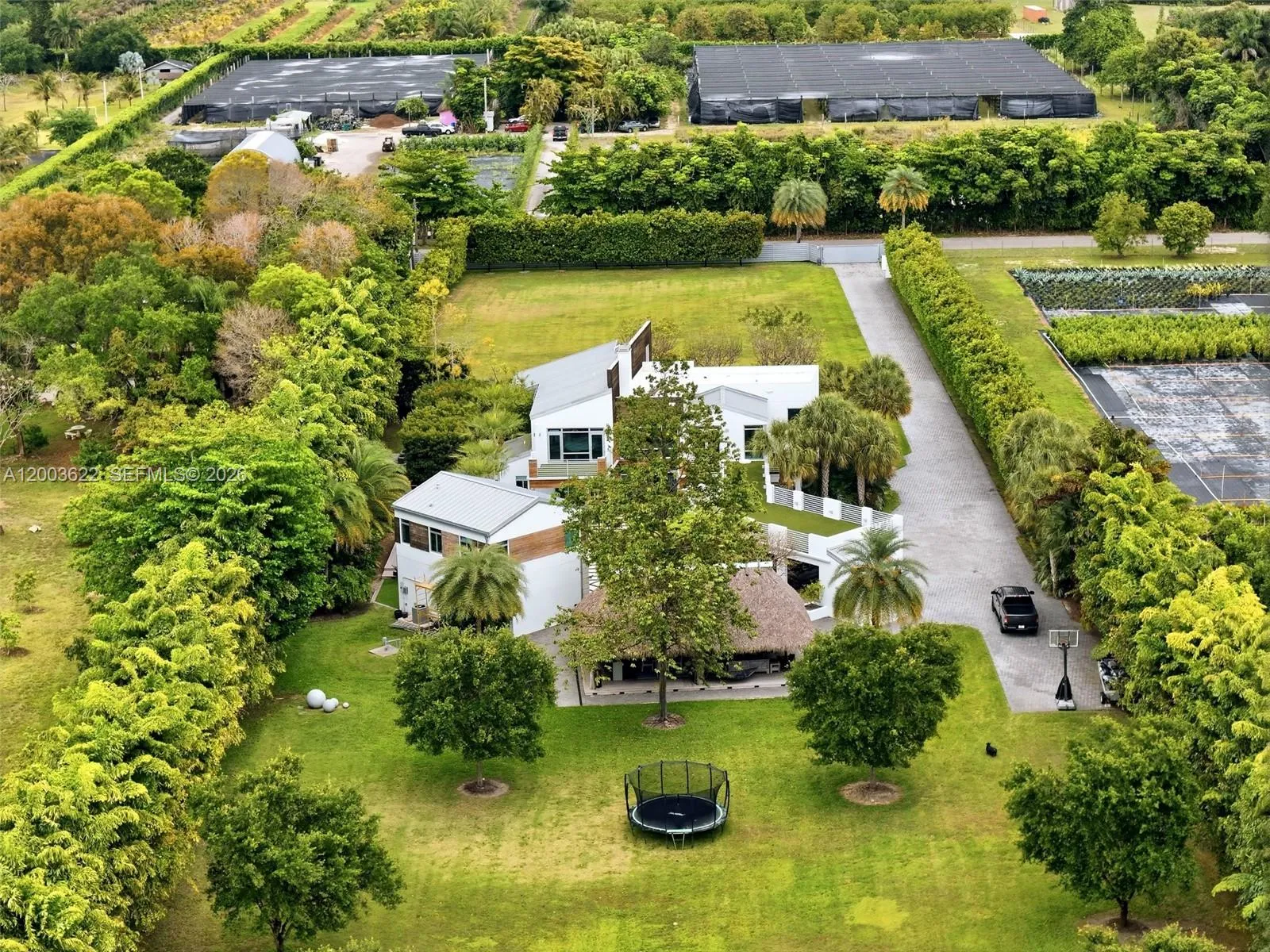 Experience unparalleled modern luxury in this spectacular split plan 6,355-square-foot architectural masterpiece set on a sprawling 2.46-acre private estate in Homestead. Designed for the most discerning buyer, this stunning compound features a main residence and secondary structures seamlessly connected by elegant breezeways and lush tropical landscaping. The striking contemporary facade, characterized by crisp white lines, natural wood accents, and expansive oversized windows, sets the tone for the exceptional design found throughout. rnrnStep inside to discover a breathtaking two-story great room anchored by a dramatic floor-to-ceiling concrete fireplace and an open-tread floating staircase with sleek cable railing. The open floor plan is bathed in natural light, highlighting the high ceilings, modern pendant lighting, and premium finishes. Entertain effortlessly in the custom industrial-chic bar area, complete with a live-edge wood counter, or utilize the dedicated professional production studio space, perfect for creatives or home-based businesses. rnrnThe outdoor living spaces rival a five-star resort. A pristine geometric swimming pool is surrounded by manicured turf and stepping-stone pathways, leading to a massive thatched-roof tiki pavilion equipped with built-in seating and an outdoor television. Multiple covered terraces, two second-floor balconies overlooking the grounds, and a magnificent paver courtyard driveway complete this extraordinary offering.