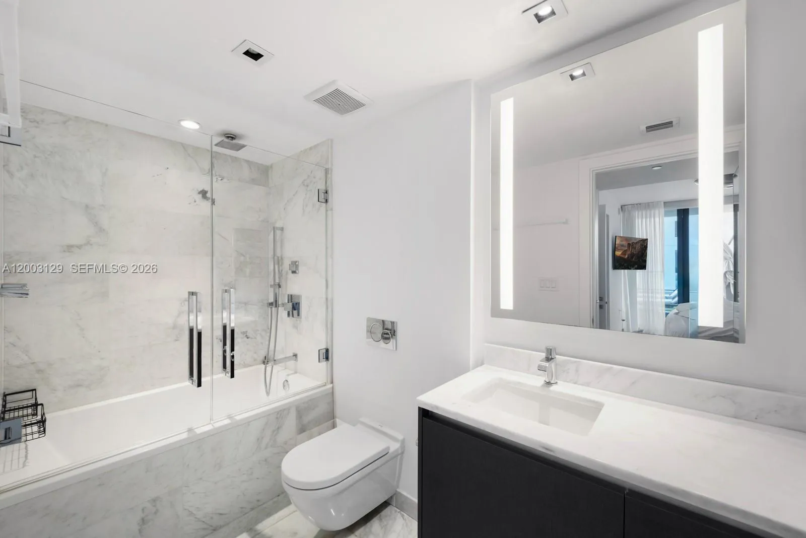 An oversized one-bedroom, 1.5-bath sanctuary, Residence 903 at Echo Brickell, designed by Carlos Ott and developed in partnership with JDS and PMG, delivers a level of scale and finish rarely found in Brickell. Spanning over 1,200 SF, the residence has been thoughtfully reimagined into a true one-bedroom retreat, featuring an expansive living area and a separate den that effortlessly functions as a private office or media lounge. Interiors are rich in texture and detail, highlighted by Venetian plaster walls, sleek marble flooring, custom ceiling lighting, and a fully integrated smart home system with wired audio and power shades throughout. The kitchen is both sculptural and functional, outfitted with premium Wolf and Miele appliances, designed for both everyday living and elevated entertaining. A defining feature is the 600 SF terrace, an outdoor extension of the home rarely seen at this scale in Brickell. Complete with a built-in BBQ, it invites seamless indoor-outdoor living, set against warm sunset light and open Biscayne Bay views. Echo Brickell offers a boutique, white-glove lifestyle with a full-floor spa and wellness level, state-of-the-art fitness center, and resort-style pool. The 44th-floor sky lounge is a true showpiece, with sweeping views of Miami Beach and a one-of-a-kind rooftop pool. Residents enjoy 24-hour concierge, complimentary pet walking, and chauffeur service.