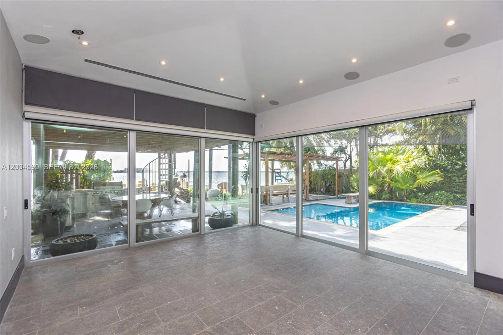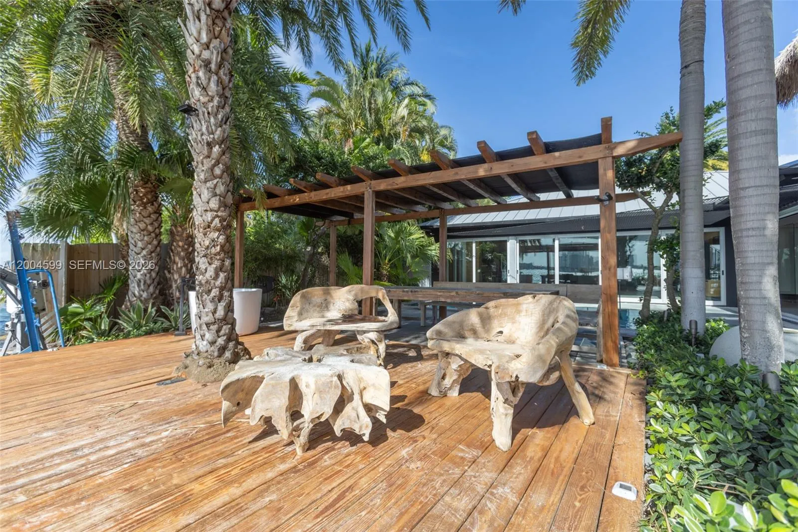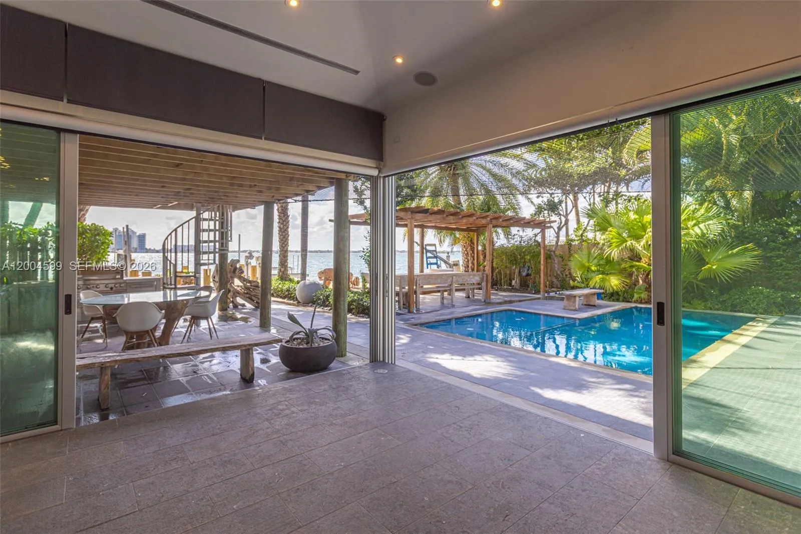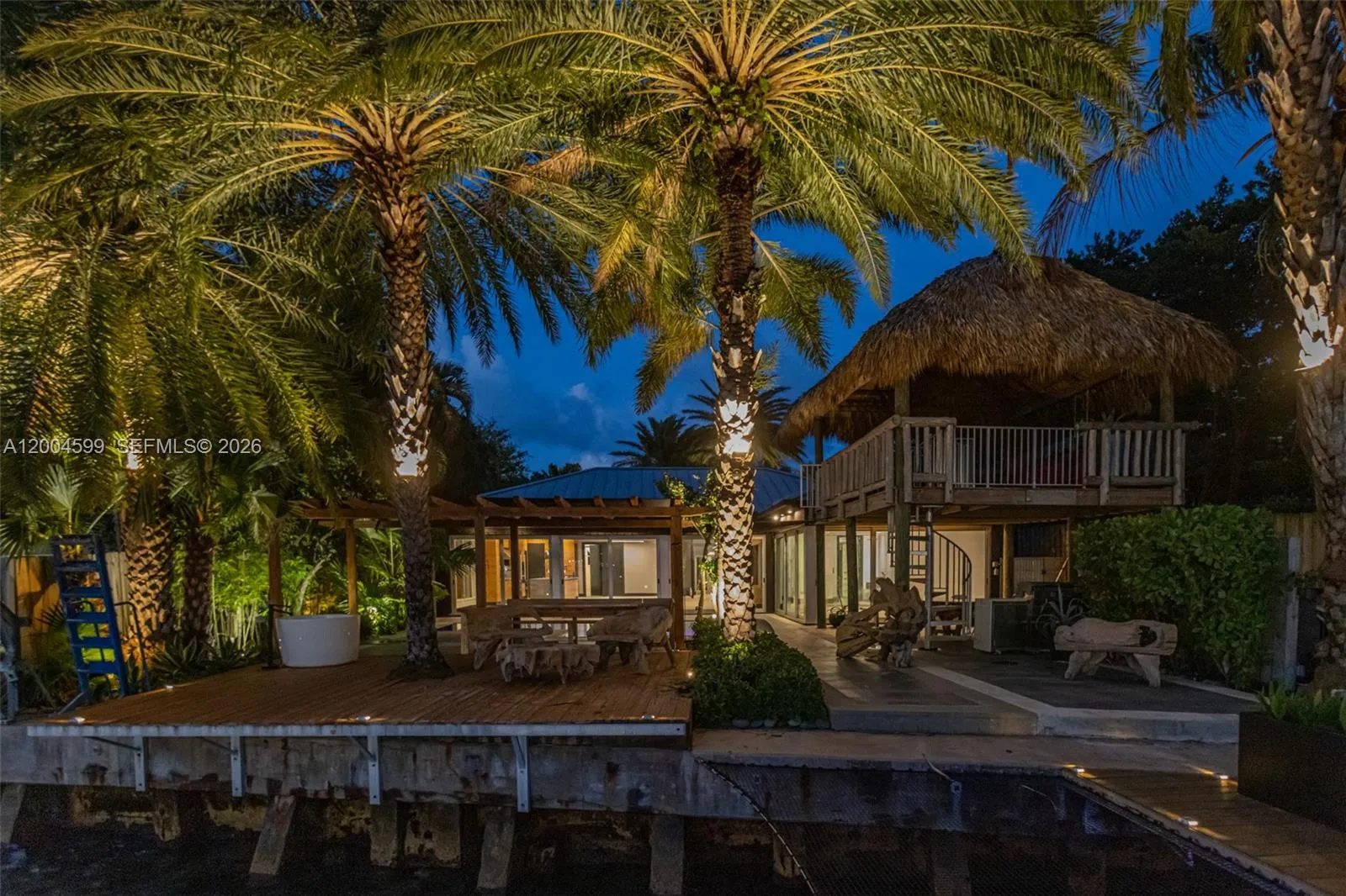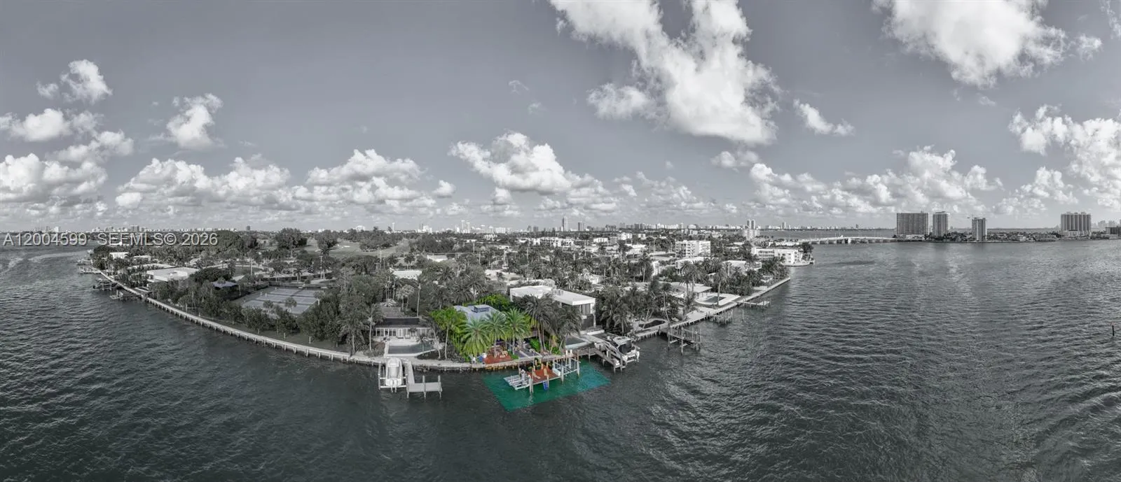 A rare waterfront home with a design you will not find again. Located on a quiet cul-de-sac inside the gated community of Normandy Shores, Set on a 9,000 SF lot with 80 FT of direct bay frontage, this property offers privacy, space, and open water views, access to golf, tennis, basketball courts, and parks. Set on the island’s Terrace and shared with only a few homes, it captures wide open bay views and stunning sunsets.rnBuilt in 2015, the home offers approx. 3,442 SF with 4 bedrooms and 4 bathrooms. The layout flows through open living and dining areas into a modern kitchen designed for both function and entertaining. From the moment you arrive, the home creates a calm feel. A bamboo garden welcomes you, leading to a striking 30 ft interior waterfall that sets the tone throughout. The outdoor space is built to enjoy. Lush landscaping surrounds a pool, outdoor kitchen, and multiple terraces. Relax in the outdoor soaking tub, host gatherings under the two story tiki hut, or enjoy quiet evenings by the water. The private dock allows you to take in the bay at sunset.rnThe property also includes boat and jet ski lifts, a davit, and plans for a future two car garage. A true opportunity for someone looking for a different kind of waterfront living experience.