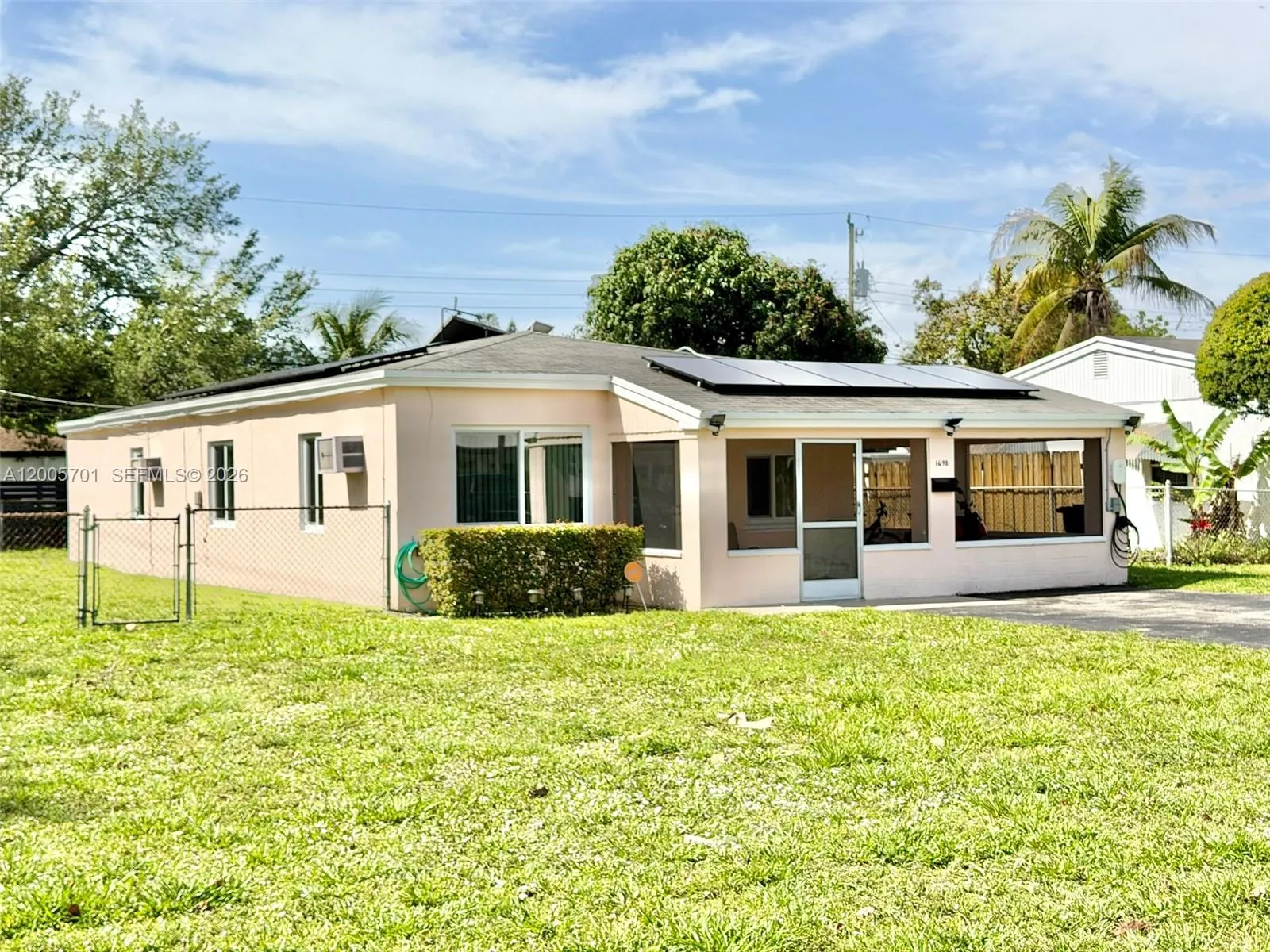 Well-maintained single-story 3-bedroom, 2-bath home in North Miami Beach, owned and cared for by a long-time owner, situated on an oversized corner lot with a fenced yard and room for a pool. This property features a large L-shaped screened porch perfect for outdoor living, a primary suite with a spacious walk-in closet and remodeled bathroom, and a functional kitchen with a stainless steel refrigerator and glass-top electric oven. Key updates include a new roof (2017), solar panels for energy efficiency, hurricane impact windows and doors, an upgraded electrical system, and a tankless hot water system. Additional highlights include a dedicated laundry room with full-size washer and dryer and the added benefit of no flood insurance required. A solid home with great bones, offering comfort, space, and potential in a desirable location.