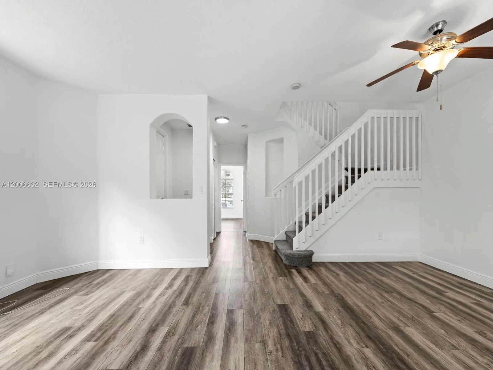 Discover modern comfort and versatility in this stunning two-story corner townhome, ideally situated within a secure gated community. The open-concept interior is bathed in natural light, showcasing sleek wood-look flooring and a neutral palette that perfectly complements any decor. At the heart of the home, the chef-inspired kitchen is finished with elegant white shaker cabinetry, pristine quartz countertops, and a classic subway tile backsplash, all centered around a full suite of stainless steel appliances.rnrnUniquely designed for modern living, this residence features a rare and highly sought-after first-floor bedroom, offering the perfect setup for a guest suite, home office, or multigenerational living. Large sliding glass doors lead from the main living area to a private, fully fenced-in backyard, providing a secluded oasis for outdoor dining, pets, or relaxation. This fee-simple property also includes the added convenience of a private garage and a layout that maximizes the privacy only a corner unit can provide.rnrnThe lifestyle here is defined by convenience and resort-style amenities. Residents enjoy exclusive access to a sparkling community pool and a fully equipped fitness center. Providing exceptional value, the monthly HOA fees include both high-speed internet and cable, simplifying your utility bills and ensuring you stay connected from day one. This turnkey home offers a perfect blend of style, function, and community perks in an unbeatable location.