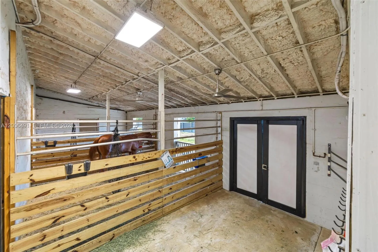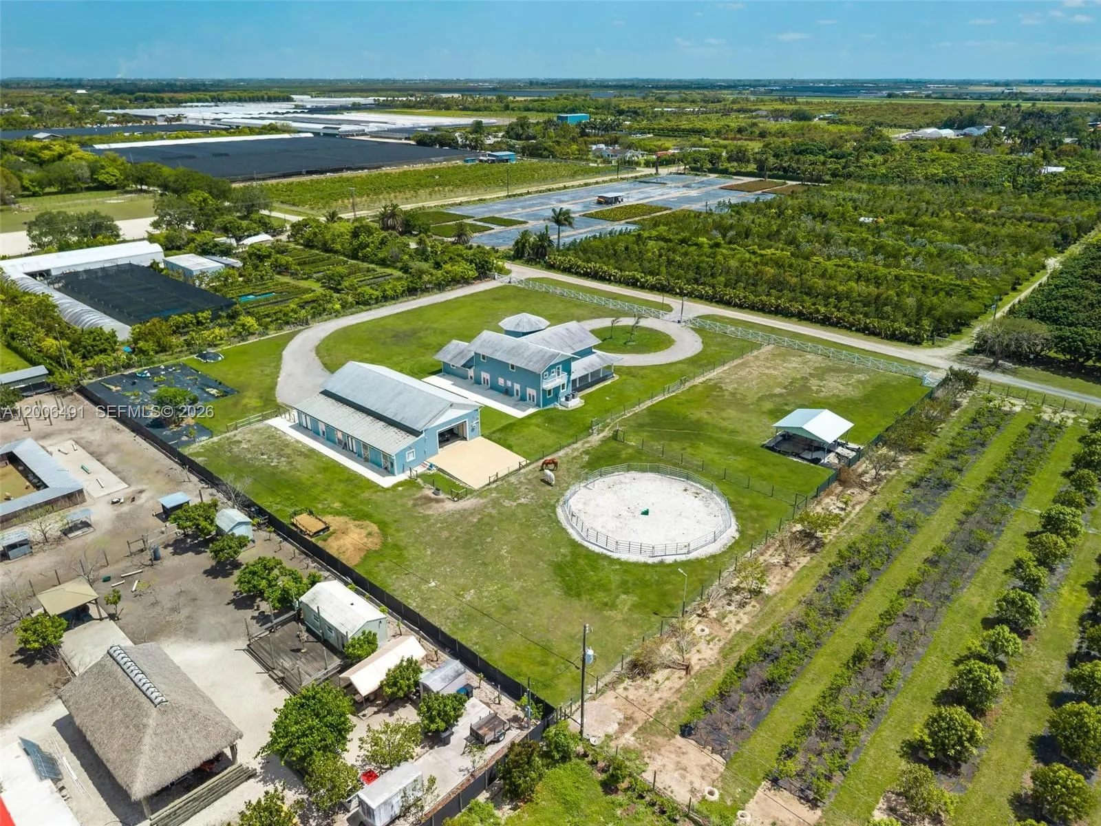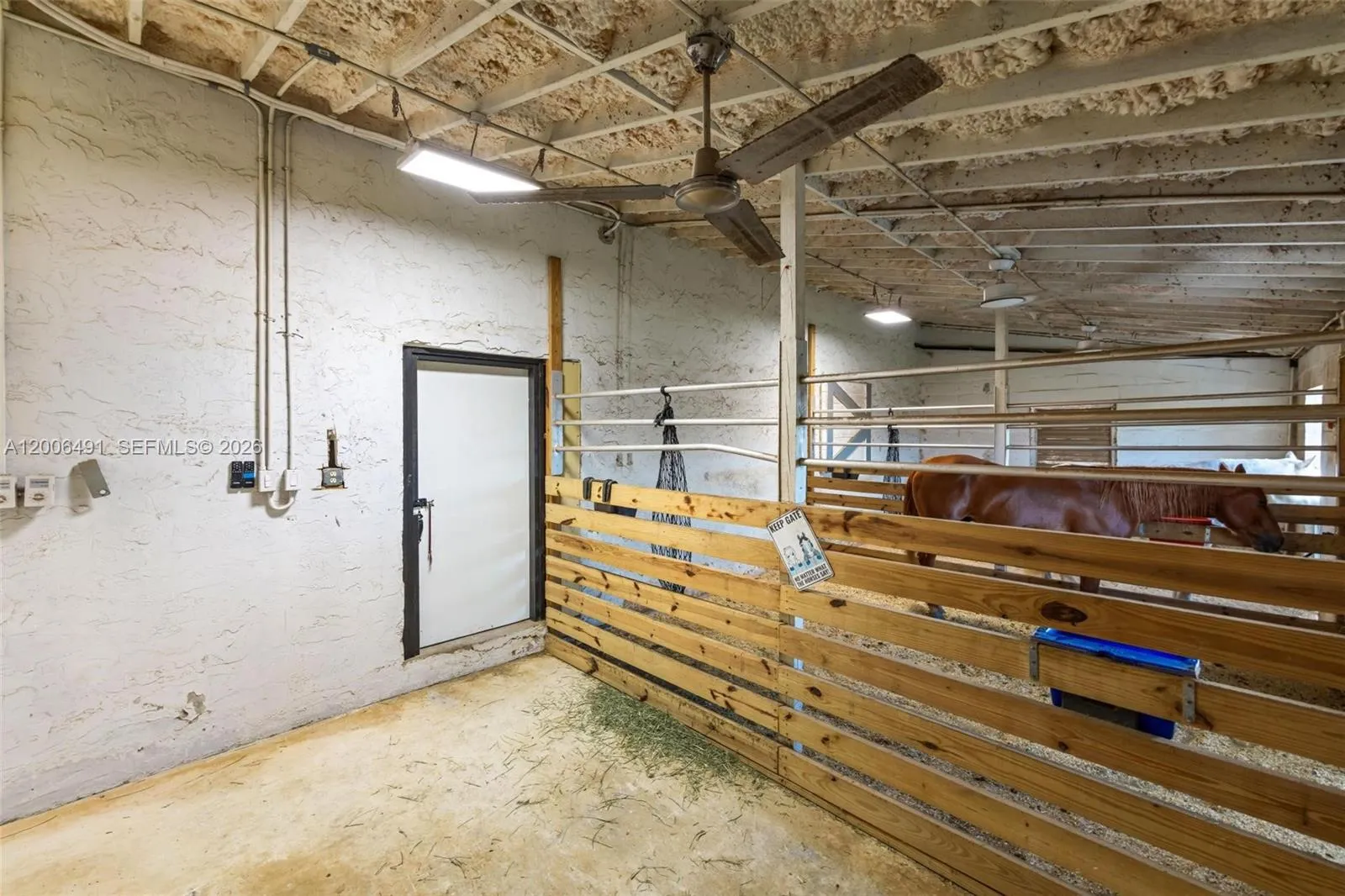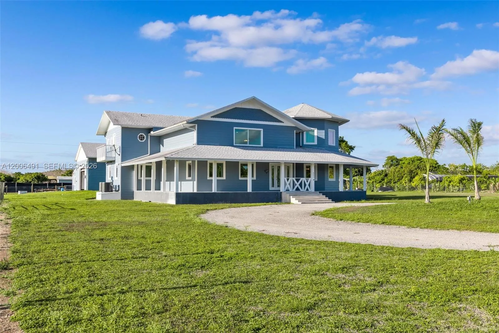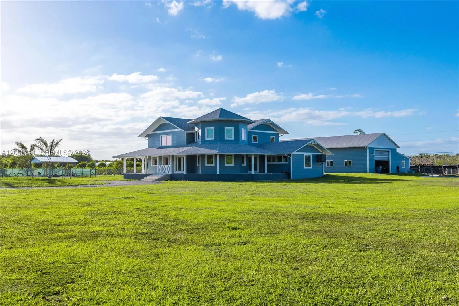 Welcome to a private equestrian retreat in the heart of the Redland, set on approximately 2.23 acres of beautifully maintained grounds. This impressive estate offers over 4,400 square feet of living space with 4 bedrooms, 3.5 bathrooms, and expansive open living areas designed for effortless entertaining. The home features impact windows and doors throughout, LifeProof flooring, fully renovated bathrooms with glass enclosures, a newly added guest half bath, an upgraded laundry room, and three new AC systems.rnrnThe property is thoughtfully designed for equestrian use and includes a fully reconstructed barn with two horse stalls, custom stall doors, a climate controlled tack room, feed and storage areas, automatic water system, lighting, and fans. Additional amenities include a round pen with sand footing, a 24×24 insulated horse shade, new horse-wire fencing, separate paddocks, and a custom wood front fence with two gates with automatic openers.rnrnThe landscaped grounds showcase a Royal Palm lined entry, leveled and usable land, concrete access areas, turf installations, and two paved driveways. A detached garage and workshop offers upgraded electrical, a full bathroom, dog wash, and multiple air-conditioned spaces. This turnkey estate delivers exceptional Redland equestrian living.