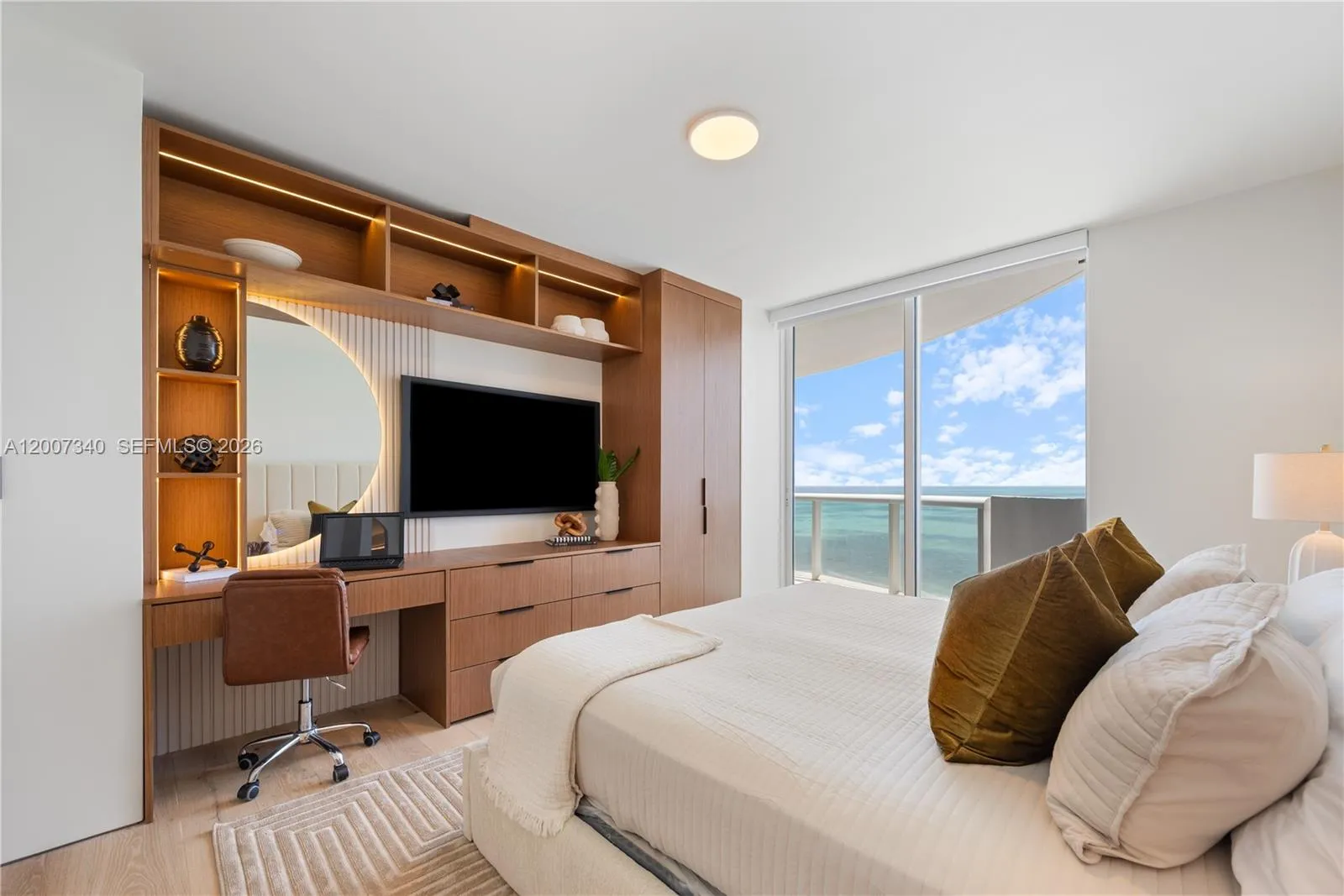 39th-floor sky residence with commanding panoramic views of the Atlantic and Miami skyline. Masterfully reimagined, this 2-bedroom, 2-bath home is a rare blend of elevated design and uncompromising execution. Upon entry, a striking custom bar with built-in coffee system and wine cooler creates an unforgettable first impression. A bespoke kitchen with premium Miele appliances anchors the home, while custom millwork, designer closets, integrated media walls, flush frameless doors, and refined architectural detailing elevate the interiors. The serene primary suite is complemented by a spa-inspired bath with jetted soaking tub. Residents enjoy direct beach access, beach service, resort-style pool, fitness center, tennis, valet, and more.