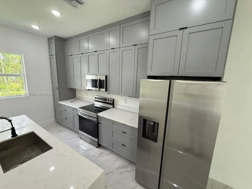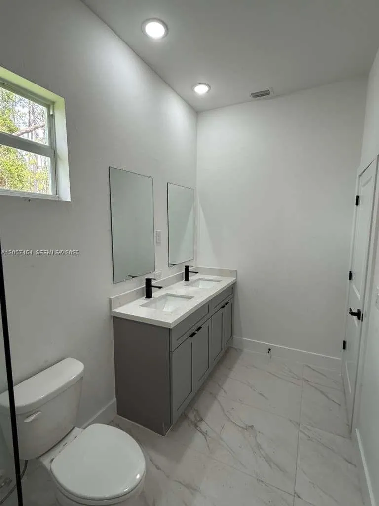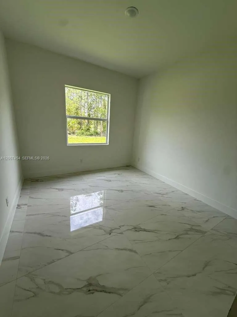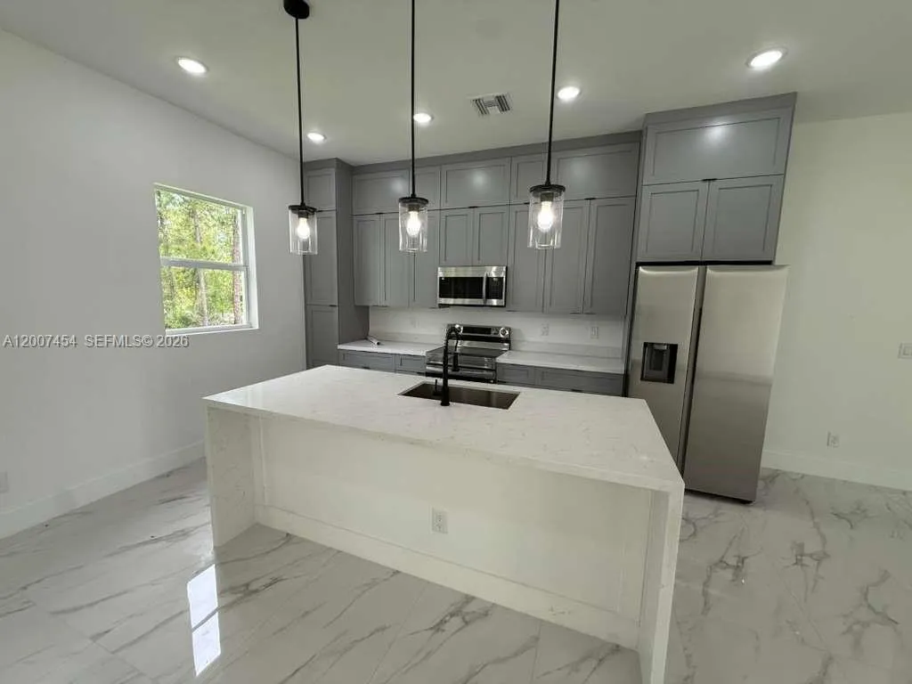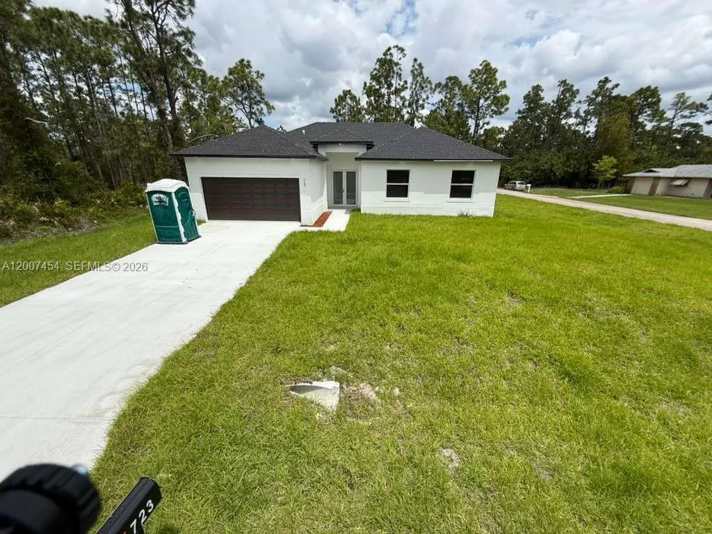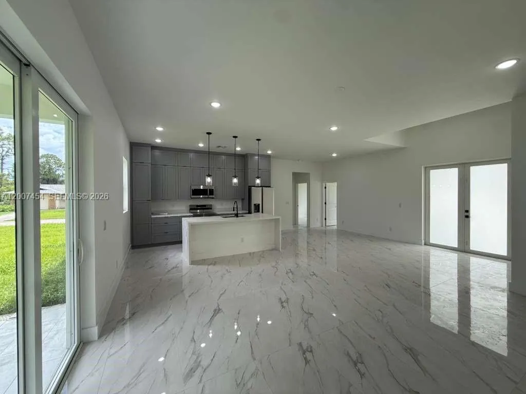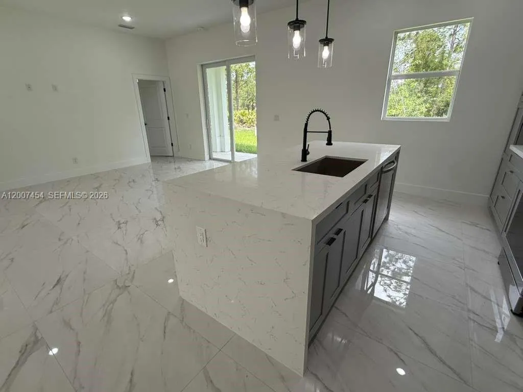 Brand New Construction in Lehigh Acres Beautiful new construction featuring 3 bedrooms + den and 2 full bathrooms, designed with a bright open-concept layout and modern finishes throughout. Enjoy porcelain tile flooring, high ceilings, and a sleek kitchen with quartz countertops, large island, stainless steel appliances, and custom cabinetry. The flexible den is perfect for a home office, guest room, or additional living space. Additional highlights include impact windows and doors, 2-car garage, and a dedicated laundry room. The primary bathroom offers a double vanity with contemporary design. Located on a spacious lot in a growing area of Lehigh Acres, this home is ideal for both end-users and investors, offering strong rental potential and long-term value.