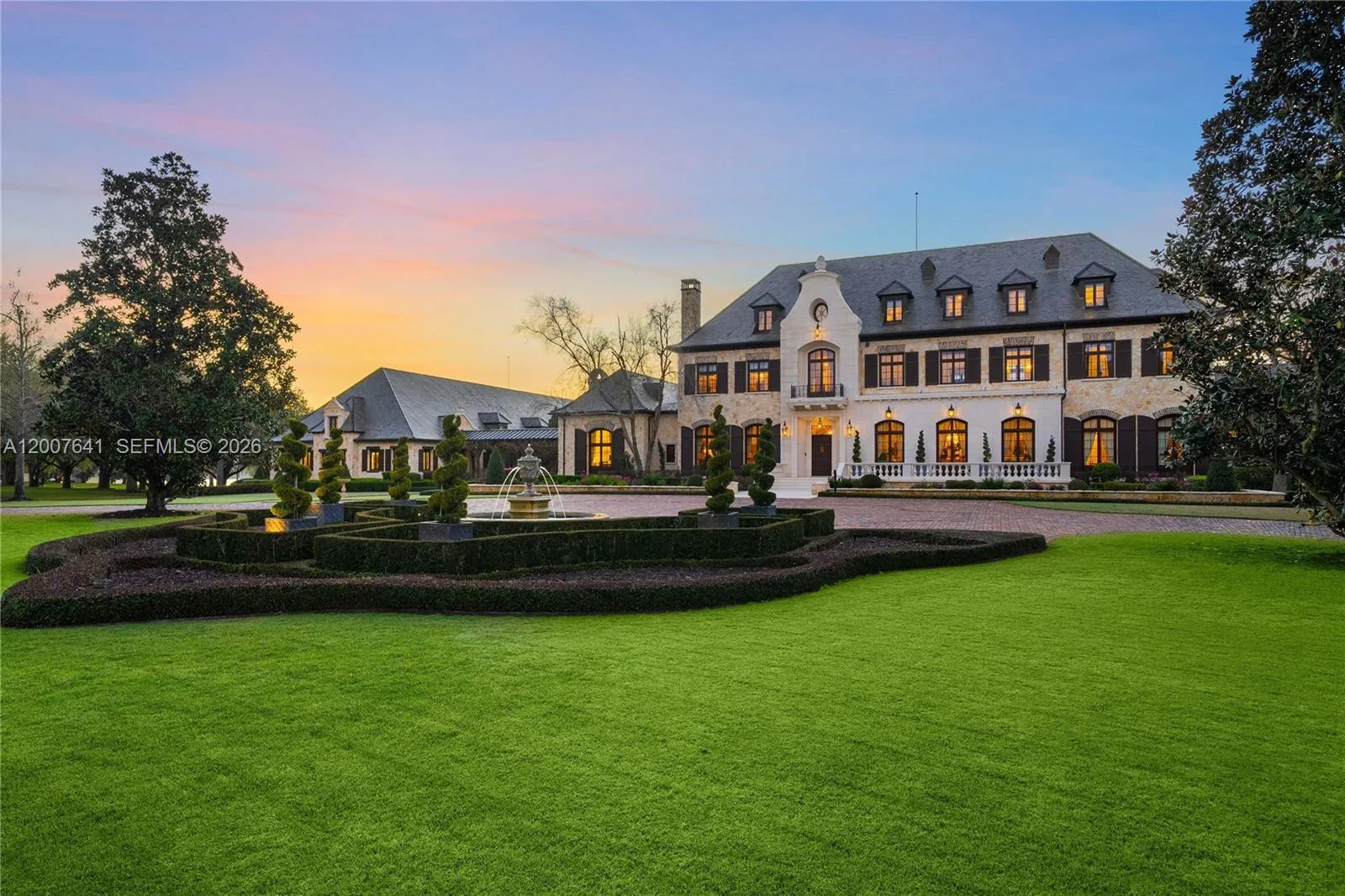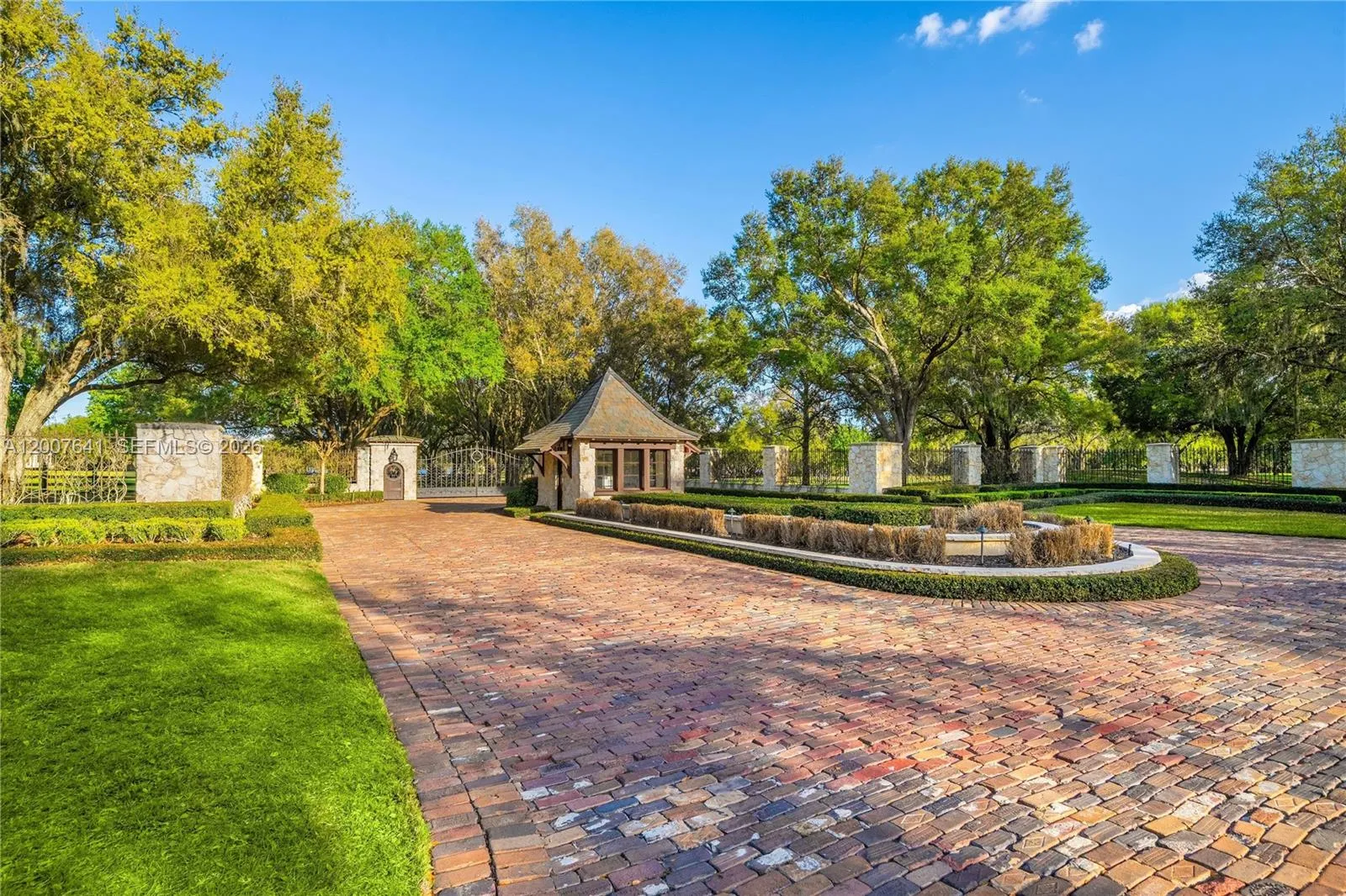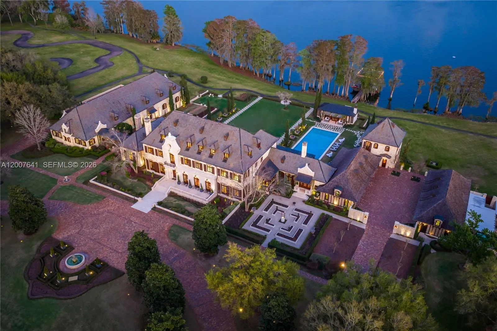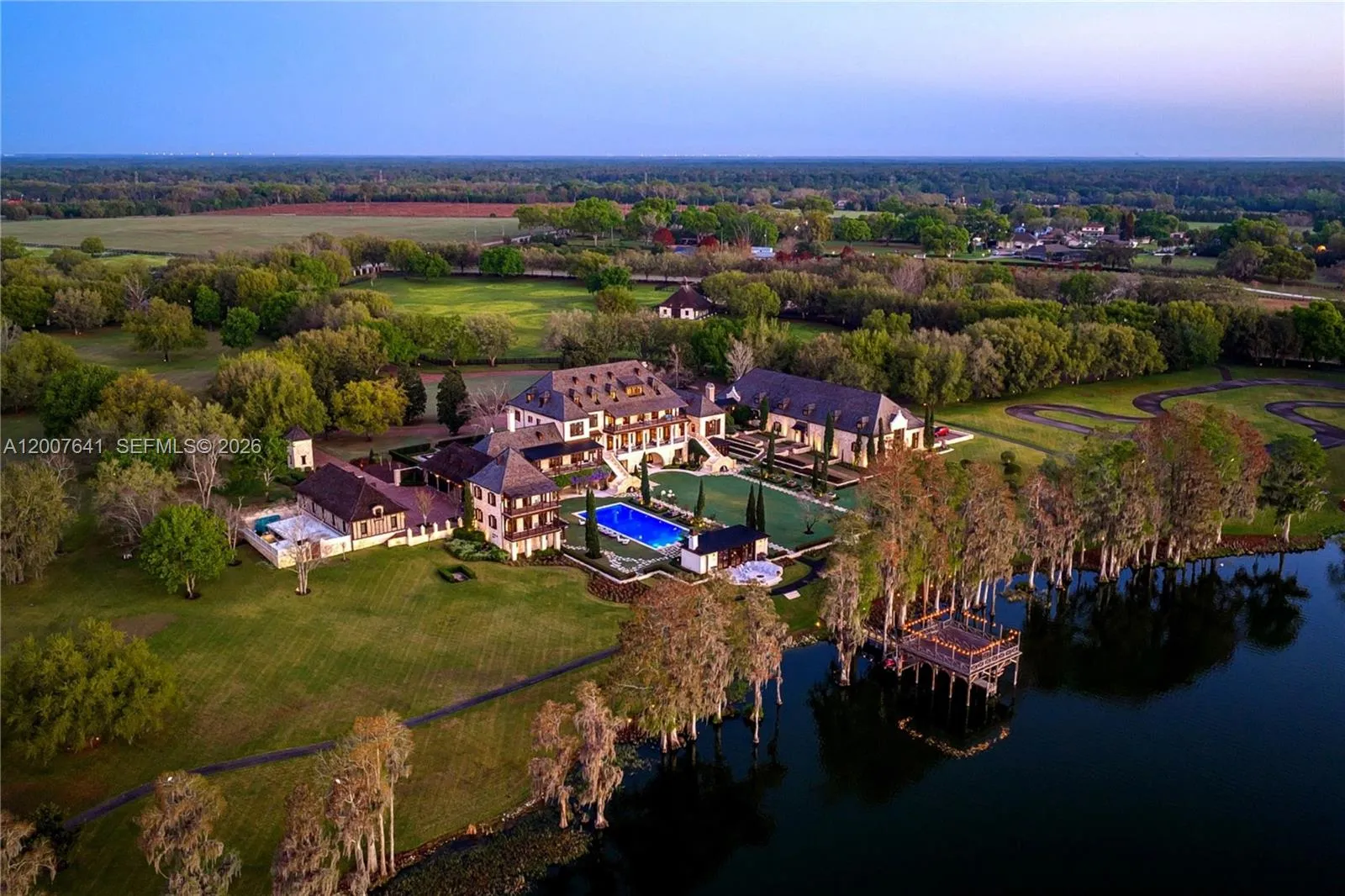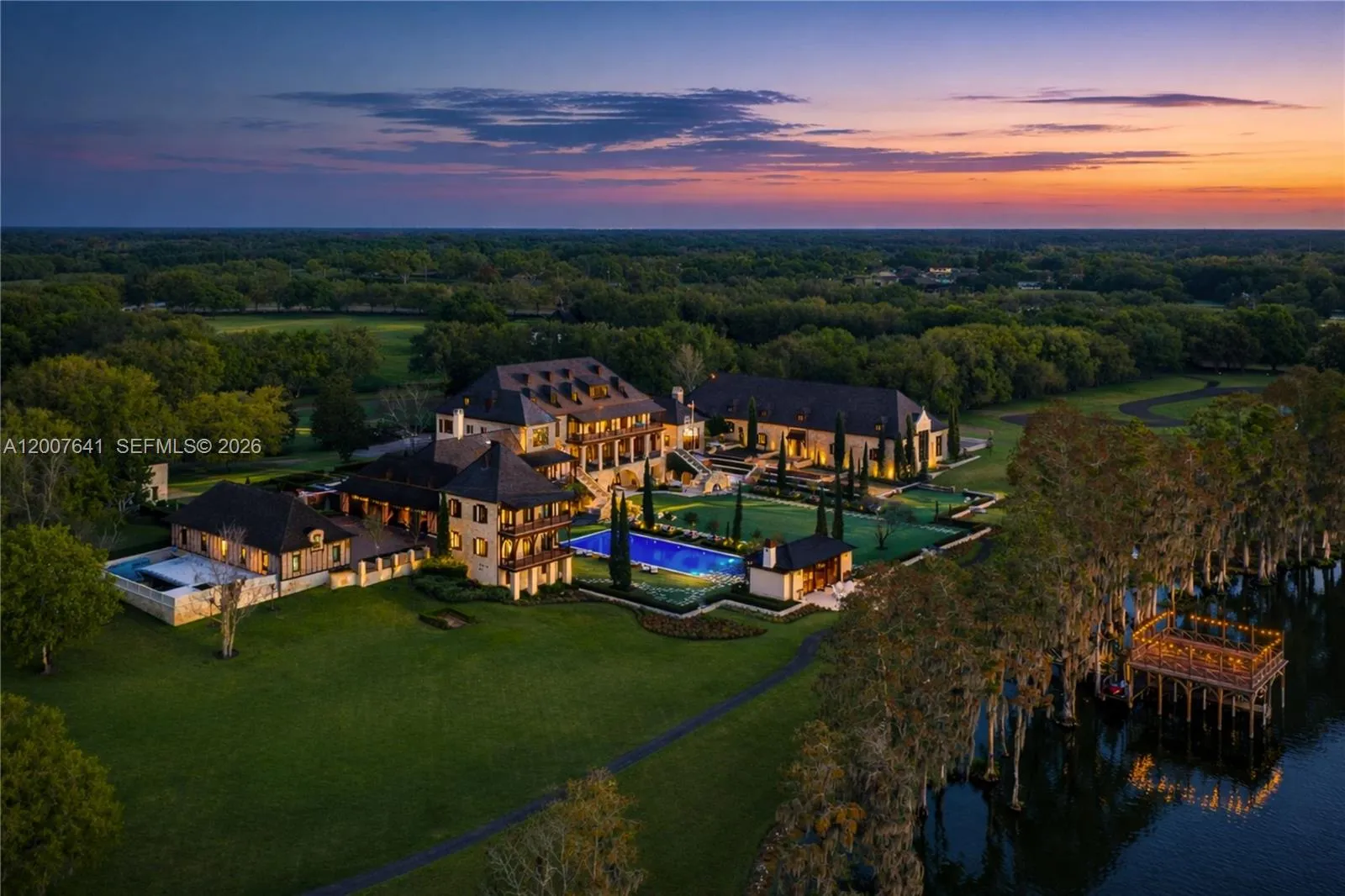 One of the most significant private estates ever built in Florida and the U.S., The Oaks Estate is an extraordinary 87-acre lakefront compound on Lake Thonotosassa, with arrival by seaplane or helicopter. Ideally located 10 min. to the executive airport and 20 min to Tampa, this authentic French Normandy château offers unmatched scale, privacy, and permanence. A 36-acre stone-walled compound anchors the estate, complemented by a 51-acre greenbelt reserve. Entry begins at a gas lamp–lit guardhouse, leading beneath mature oaks to a grand arrival of fountains and a limestone-clad residence. The 42,782 SF home showcases exceptional craftsmanship in stonework, and millwork, featuring hand-scraped French oak floors in Versailles and herringbone patterns. The grand salon with pillowtop limestone floors, opens through a gallery of 12ft arched mahogany doors to terraces framed by solid limestone columns, an architectural feat rarely seen in residential setings. The culinary wing features bespoke La Cornue Cheateau appliances, a butler’s kitchen, and family room.The Oak Room lounge offers a full service bar, wine storage, limestone fireplace and concealed theater. AWow factors: a 24-car automotive museum with a floating glass boardroom, bowling alley, billiards, cinema, wellness center with gym/spa, hammam/sauna, and indoor saltwater pool. Outdoors: 72′ pool, pool house, go-kart circuit, boathouse, 1 mile jogging path, pro-equestrian, and operations comopund with automotive workshop.