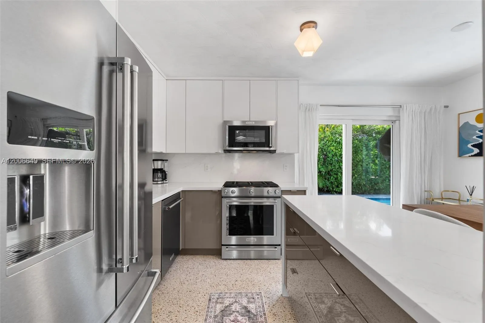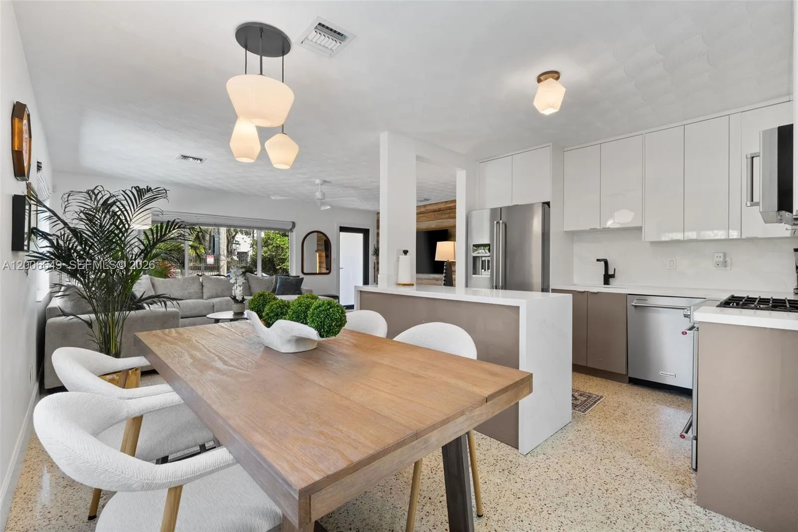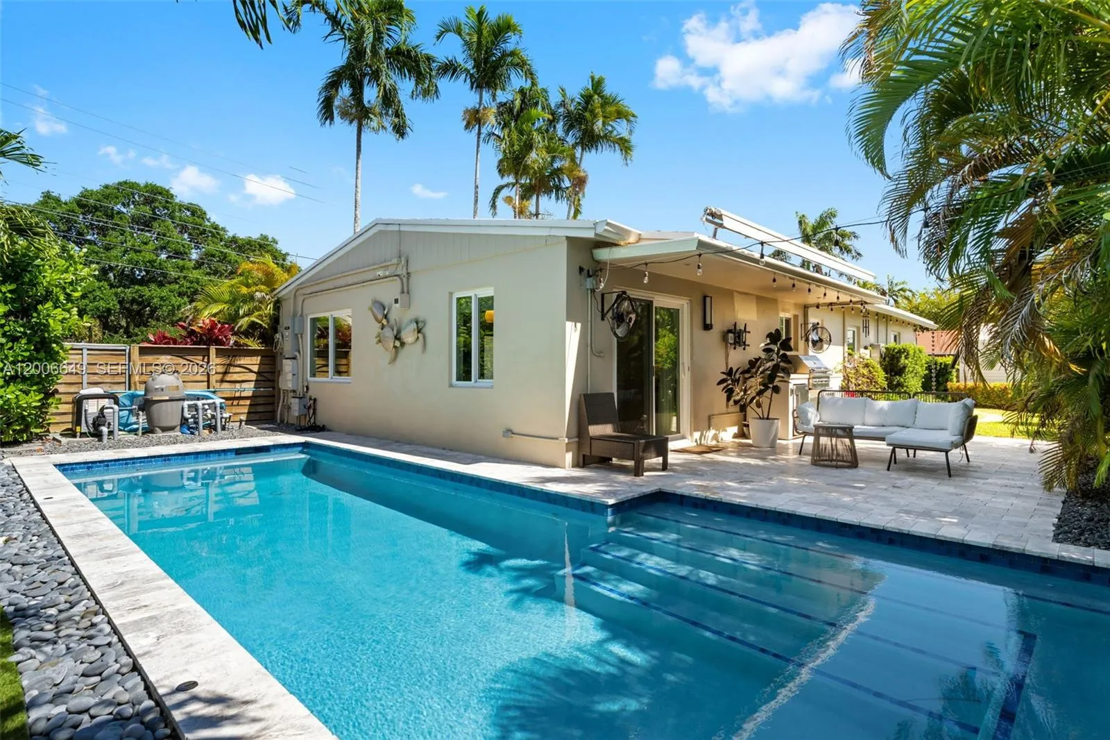 Experience timeless style and modern comfort in this beautifully maintained 3-bedroom, 3-bathroom pool home, ideally located just minutes from North Lake and the beach. Meticulously cared for and thoughtfully updated over the years, this residence features original terrazzo flooring and an open-concept layout designed for both everyday living and entertaining.rnThe updated kitchen offers elegant Italian two-tone cabinetry, striking waterfall countertops, and stainless steel appliances, seamlessly combining style and functionality. The well-designed floor plan includes two spacious primary en-suites, along with an additional guest bedroom and full bath, providing flexibility for hosting guests or accommodating extended stays.rnStep outside to a private tropical retreat featuring a beautifully designed pool, summer kitchen, outdoor television, lush landscaping, and a shaded canopy—perfect for outdoor entertaining and enjoying the Florida lifestyle year-round.
