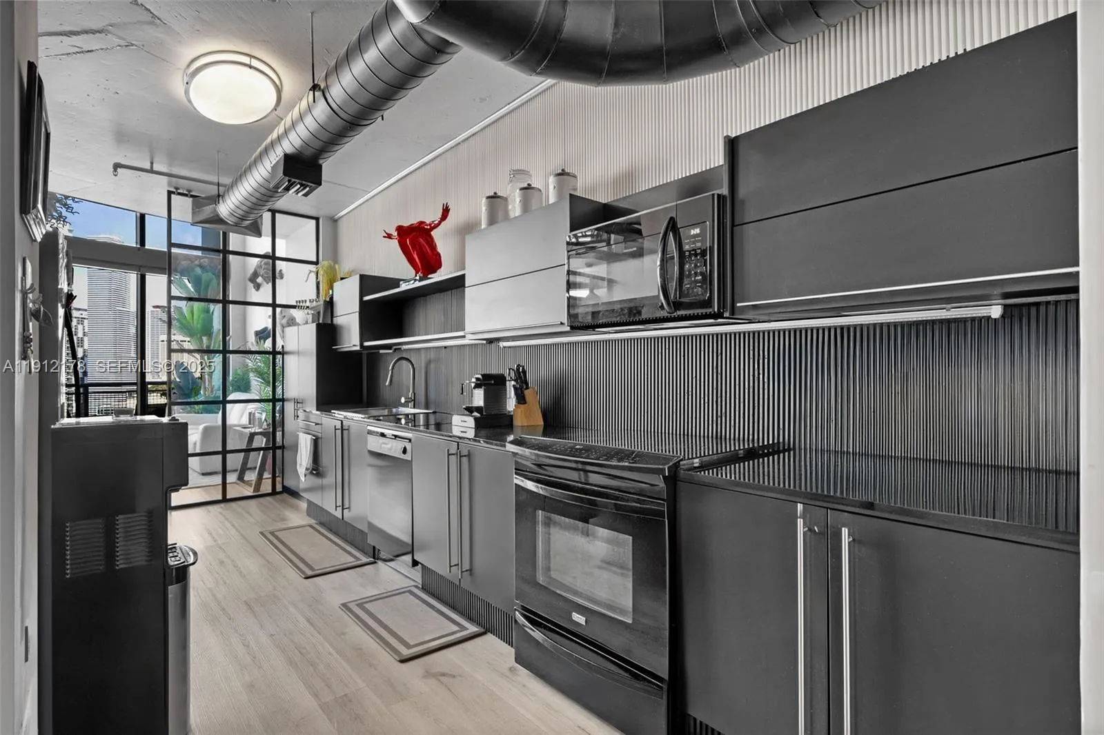 Stunning two-story industrial loft in the heart of Brickell featuring dramatic double-height ceilings, expansive glass walls, and unobstructed skyline and river views that transform every room into a visual masterpiece. This 1,337 sq ft open-concept residence is bright and truly one-of-a-kind—perfect for those seeking style, architecture, and energy in one of Miami’s most vibrant neighborhoods. The sleek black kitchen includes full-size stainless steel appliances, updated cabinetry, open shelving, and generous counter space ideal for cooking and entertaining. The loft bedroom overlooks the main living area with privacy glass sliders, custom closets, and flexibility for workspace or lounge seating. Two modern full bathrooms are finished with contemporary black and gray textures, frameless shower glass, and designer fixtures. Enjoy indoor-outdoor living from your private balcony overlooking the city. Neo Vertika delivers resort-style amenities including fitness center, rooftop pool, security, valet and more. Walk to Brickell City Centre, restaurants, shops, MetroMover, art, and nightlife. A rare opportunity to own an architecturally distinct duplex home with exceptional design and location.