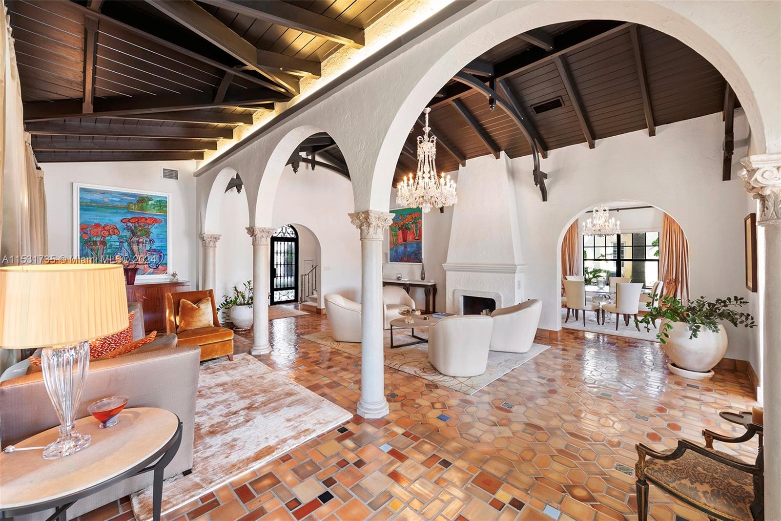 “El Escape” – an Italian Villa nestled within the lush Venetian Islands features stunning, original architectural details and panoramic vistas of Biscayne Bay from every angle! Step inside to discover majestic living spaces with soaring cathedral-beamed ceilings, oversized arched windows and doorways, fireplace, and original Arabesque tile floors. Oversized primary suite with modern bath, gourmet kitchen, family room, 3 beds in main house, “secret room”, guesthouse, and a 2-car garage awaiting discovery! Enjoy the tropical scenery of Venetian Islands and glistening water views from your secluded backyard! This home is a hidden tropical retreat offering a sanctuary for relaxation and entertainment, and ideal central location with access to all the wonders of Miami’s vibrant landscape.