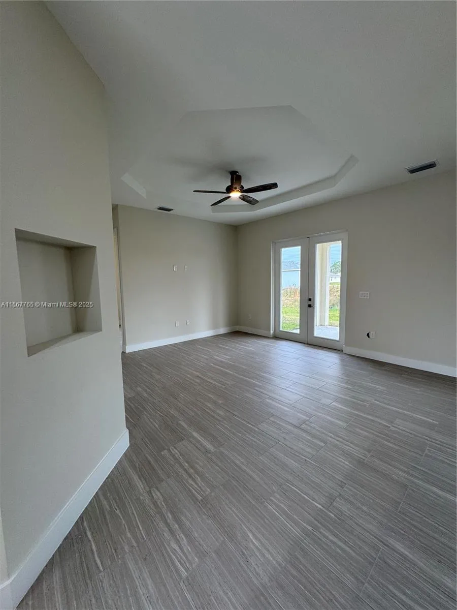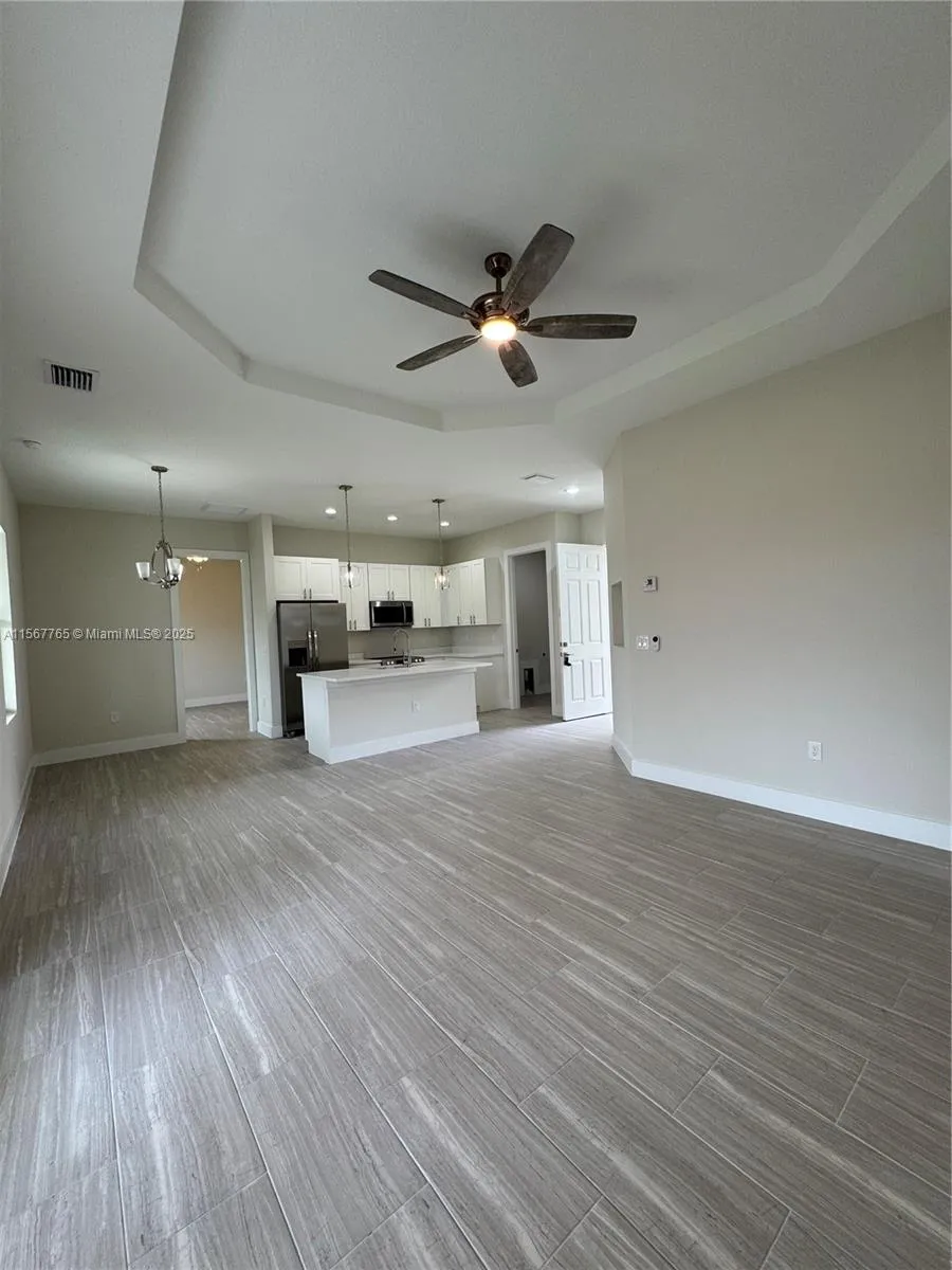 Spectacular brand new house! 1 story, single family home located in a great community in Lehigh Acres. Florida. Open concept floor plan with vaulted ceilings and spacious living room. 4 bedroom’s 2 bathrooms and 2 car garage with a bay for an additional 4 cars. Bedrooms have large walk-in closets and primary bathroom has his and hers sinks and tiled shower. Granite counters in bathrooms and kitchen center island, soft close cabinets, and stainless steel energy efficient appliance package. Approximately 1,500 sq. ft. under air, over 2100 sq. ft. total. Covered terrace, great backyard, close to the Fort Myers International Airport, shopping malls. Will be ready in approximately 45 days