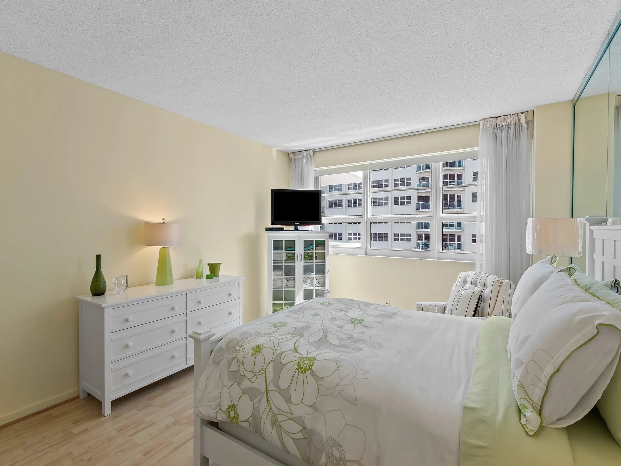 SOUTH FACING SPACIOUS 2/2 WITH OCEAN VIEWS IN THE COMMODORE!…LIVING AND DINING ROOMS ARE OPEN AND PERFECT FOR ENTERTAINING…NEUTRAL CERAMIC TILE FLOORING. DIRECT ACCESS TO YOUR PRIVATE BALCONY FROM THE LIVING ROOM WHICH OFFERS SPECTACULAR OCEAN VIEWS. HURRICANE IMPACT WINDOWS AND DOORS THROUGHOUT…FULLY APPLIANCED KITCHEN WITH ALL WHITE CABINETRY, MARBLE COUNTERTOPS, AND WHITE TILE BACKSPLASH. KITCHEN BOASTS A FULL PANTRY AND HALLWAY TO YOUR OWN FULL SIZED WASHER AND DRYER WITH EXTRA STORAGE. PRIMARY BEDROOM AND EN-SUITE FEATURES LARGE WALK-IN CLOSET, REACH-IN CLOSET, & SEPARATE DRESSING AREA…GUEST BEDROOM IS SUNNY AND INVITING…COMMODORE IS AMENITY RICH WITH 24 HOUR SECURITY, HEATED POOL, DIRECT BEACH ACCESS, FITNESS CENTER, CLUBROOM, LIBRARY, & CLOSE TO GROCERY, SHOPS, RESTAURANTS