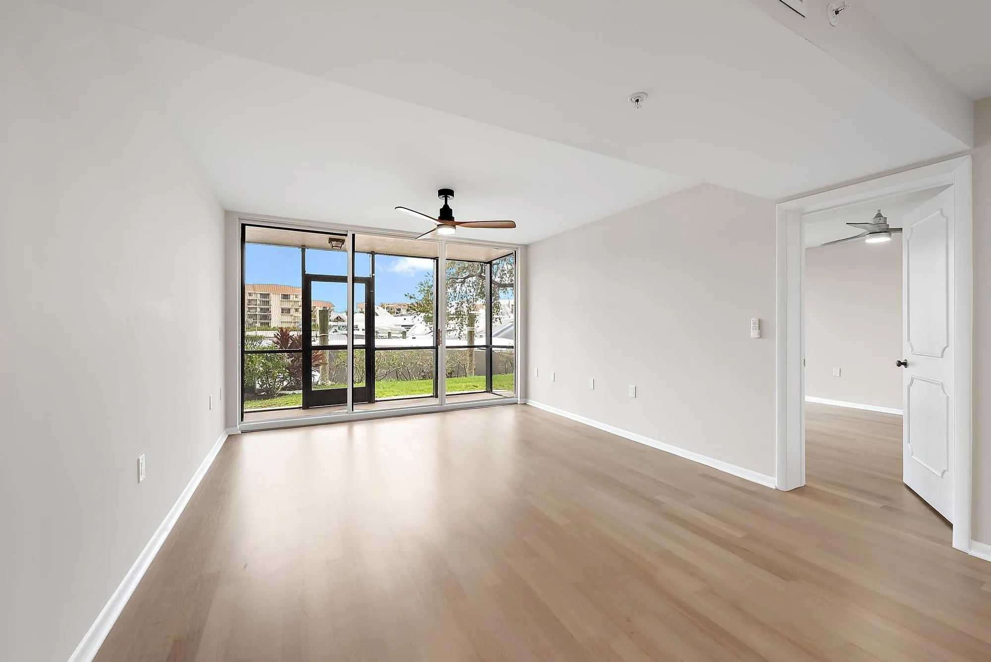 Discover this elegantly renovated two-bedroom, two-bathroom condo with an office, situated on Marina Isle Way’s first floor. Relish stunning marina views from your screened patio. The living space is perfect for entertaining, featuring a newly updated kitchen with quartz countertops, shaker cabinets, and stainless steel appliances. Luxuriously updated bathrooms showcase walk-in showers and high-end finishes. Flooring combines Italian tile with Brazilian cherry wood, accented by recessed lighting. A new laundry room includes California cabinetry and additional office space. Residents enjoy access to four heated pools and well-maintained tennis courts.