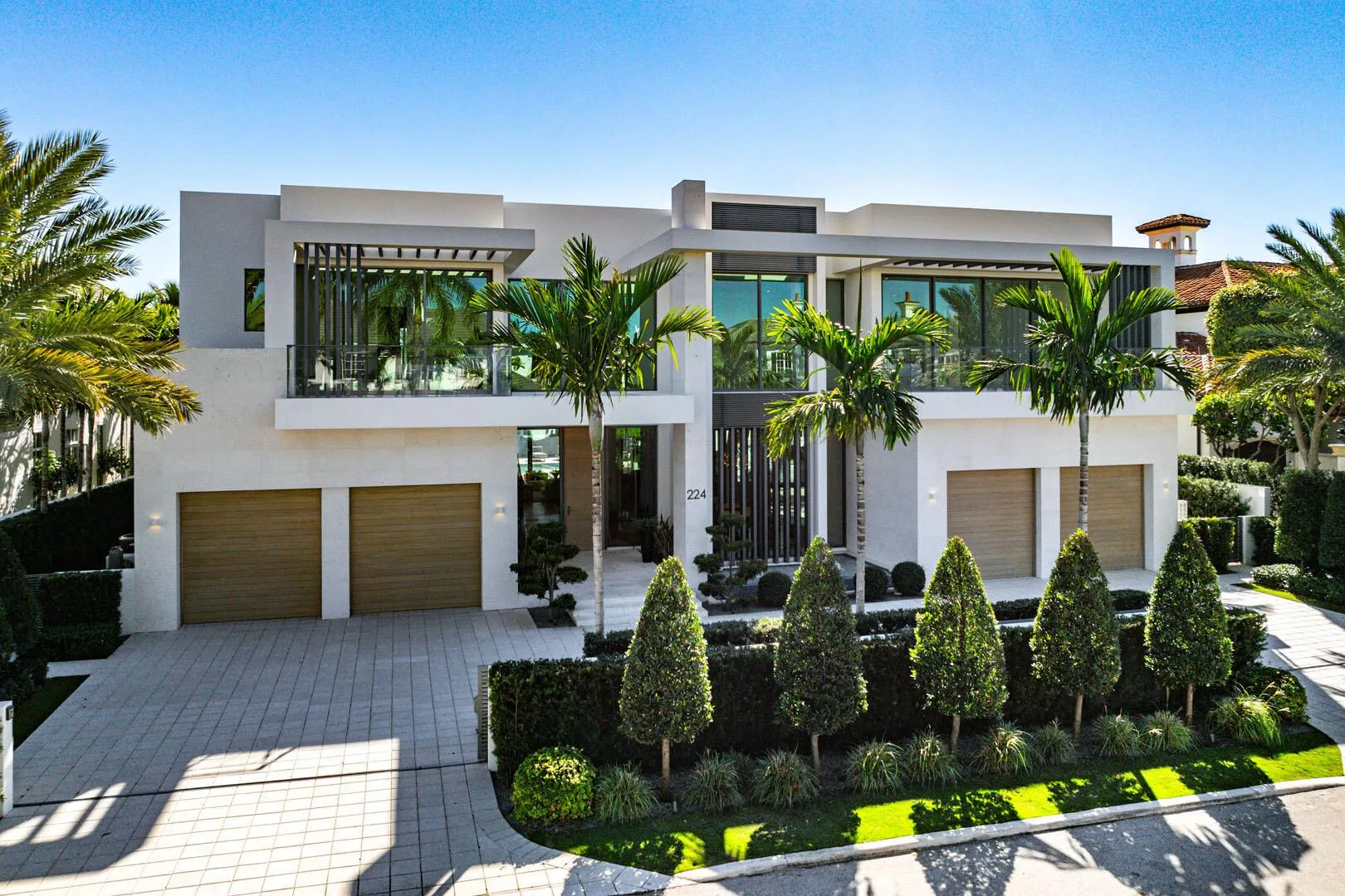 Experience the pinnacle of waterfront luxury in Royal Palm Yacht & Country Club. This extraordinary estate is masterfully crafted by the acclaimed Sarkela Corporation and Ada Architecture Design Atelier. Encompassing over 9,500 square feet of living space, this architectural masterpiece offers six bedrooms, seven full bathrooms, and two half bathrooms, all impeccably designed for unparalleled sophistication and comfort. Every detail of this home reflects the highest level of craftsmanship and quality. The interiors showcase hand-finished DuChateau premium oak hardwood floors, sleek Italian cabinetry, and elegant European marble in the kitchen and baths. Dornbracht bath fixtures and Terzani lighting installations elevate the ambiance, creating an atmosphere of refined elegance.