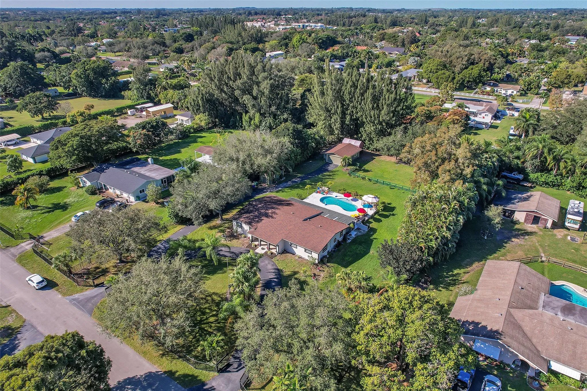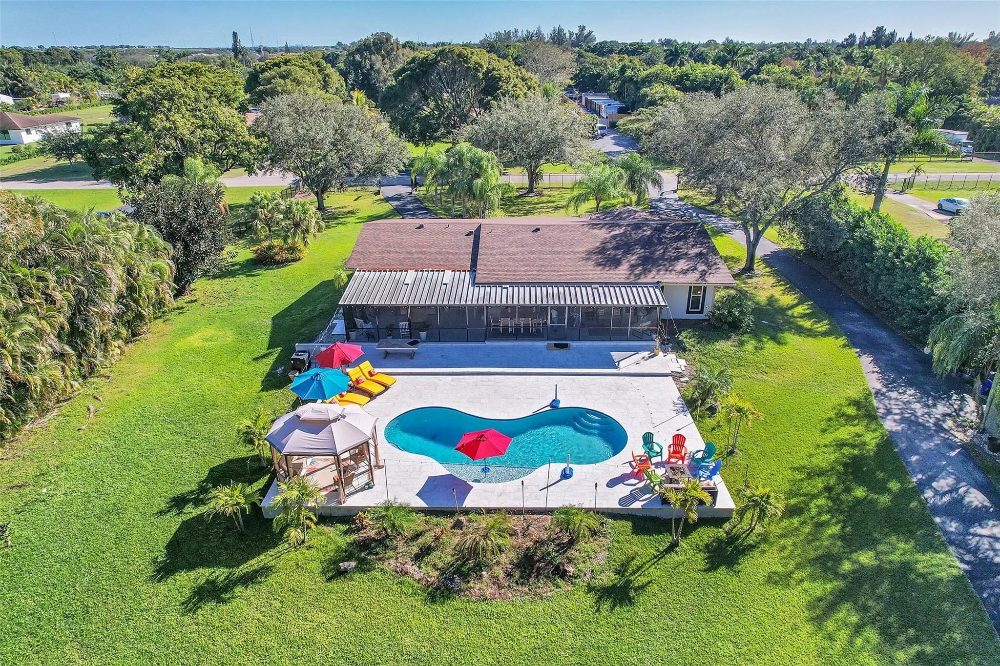 THIS CAPTIVATING HOME, WITH HIGH-CEILINGS WITH AN EXPANSIVE 5 BEDROOM 4 BATH SPLIT FLOOR PLAN SITS ON A 51,209 SQUARE FOOT LOT OVERLOOKING A BEAUTIFULLY PRIVATE POOLSIDE OASIS. OWNERS INVESTED OVER $100,000 ON A SALT CHLORINATED POOL, BEAUTIFUL HEAT-RESISTANT TILE WHICH SURROUNDS THE POOL AREA AND SCREENED IN LARGE SEPARATE PATIO. LARGE MASTER SUITE WITH A JACUZZI TUB. OPEN CONCEPT GOURMET KITCHEN FEATURING TOP OF THE LINE STAINLESS STEEL VIKING APPLIANCES, GRANITE COUNTERTOPS, HIGH WOOD BEAM CEILINGS. ELECTRIC FENCED GATE, EXPANSIVE DRIVEWAY. IMPACT WINDOWS, NEWER ROOF (APX 4 YEARS OLD). SEPARATE STAND ALONE OVERSIZED TWO CAR GARAGE WITH DUAL ENTRANCES, BARN AND OVERSIZED SHED. PRICED RIGHT WITH SO MANY PLUSES!!! THIS HOME WILL NOT DISAPPOINT.