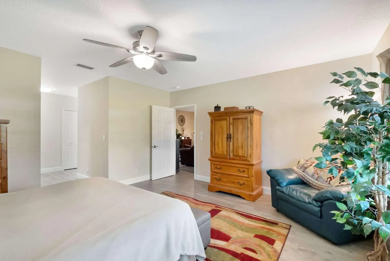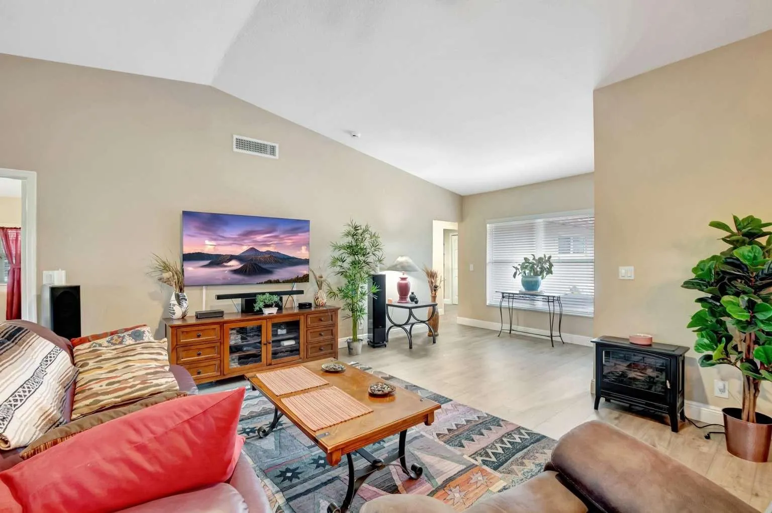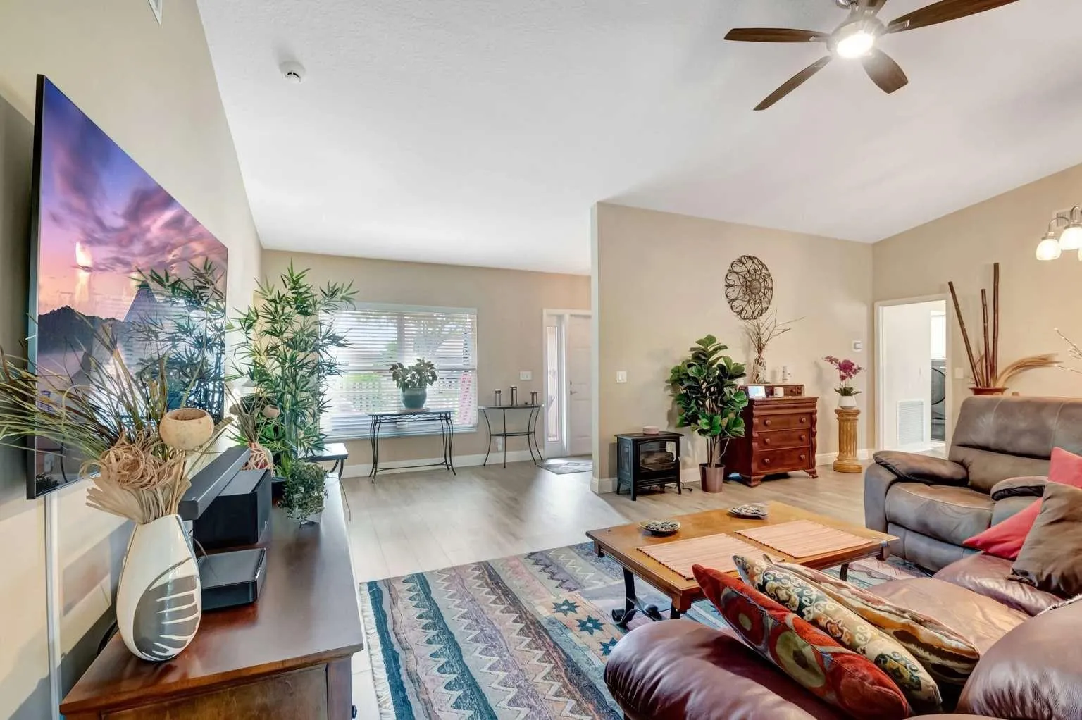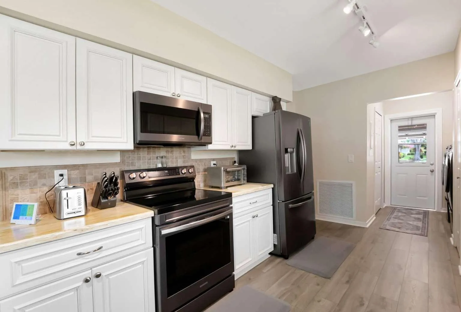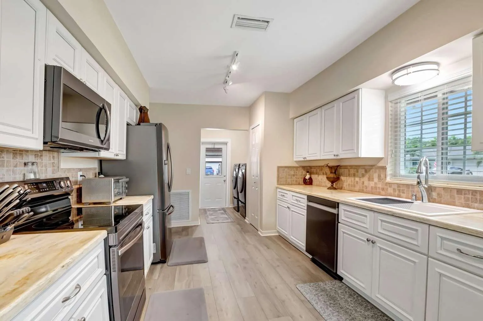 This elegant single-family home is ready for you to move in and enjoy. It features three bedrooms and two bathrooms, providing a comfortable living space for you and your guests. The open and spacious kitchen includes a breakfast bar and dinette area, perfect for meals and entertaining. The home is fitted with beautiful laminate flooring throughout, with tile floors in the bathrooms for added durability and style. The attached two-car garage boasts premium Race Deck flooring, offering both functionality and a polished look. From 2020 through 2023, the home has seen numerous upgrades, including a new air conditioning unit, refrigerator, stove, microwave, dishwasher, and gutters/leaders. The entire house has been professionally painted both inside and out. Additional enhancements include