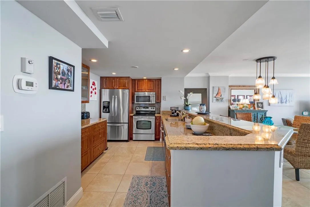 Beautifully updated south facing unit with breathtaking views of the ocean and intracoastal! Located on exclusive Hillsboro Mile. This property has been completely redone with an open kitchen, wood crown molding, and tile floor throughout. This very well-designed and decorated condo makes for an easy move in. Building is in process of concrete restoration. Extra storage locker is provided by the association. Maintenance fee includes 24/7 security guard, high speed fiber optic internet, heated salt water pool, secure underground parking, new fitness center, lounge chairs at pool and beach, BBQ grills, picnic tables, and cable & HBO. New Roof already installed by association.