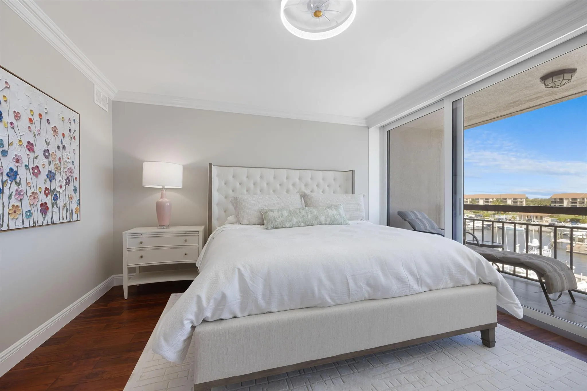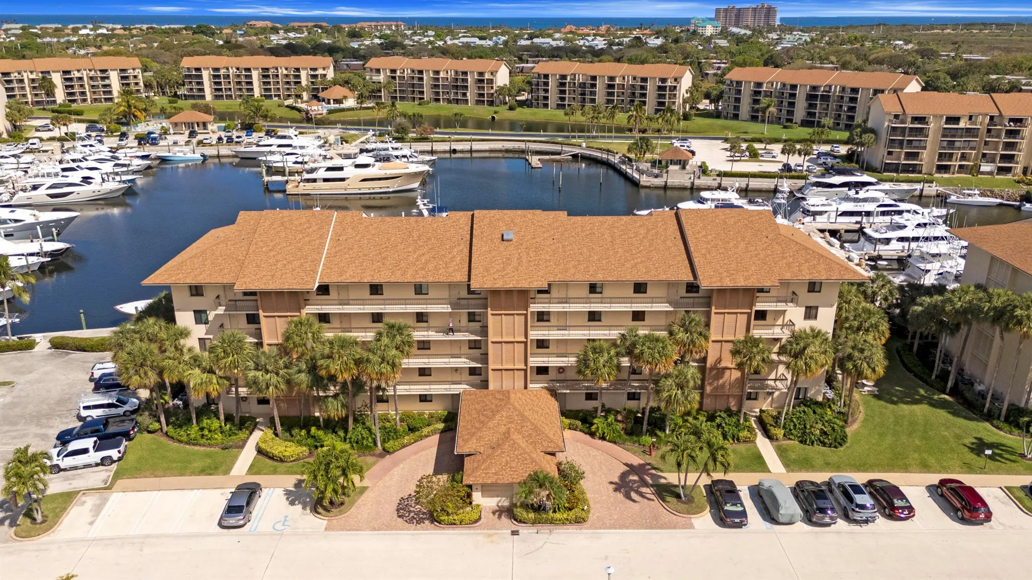Stunning 5th Floor Penthouse residence in highly sought after Marina At the Bluffs, walking distance to beach, park, shops & restaurants! Huricane impact windows & sliders. Roof (2021) HVAC (2023) New elevators. Unique floorplan offers an additional den not found in other units. Super-sized open kitchen featuring Jenn-Air suite of stainless steel appliances; induction-convection range, microwave drawer, wine cooler, French door refrigerator & d/w. Beautiful pendant lighting over expansive island. Base cabinetry offer pull-outs/tray drawer, a place for everything! Wood flooring & crown molding throughout. Decorative fire place feature in living room. Two private balconies overlook the gorgeous marina. (PLEASE CLICK ON ”MORE” FOR ADDITIONAL INFORMATION)