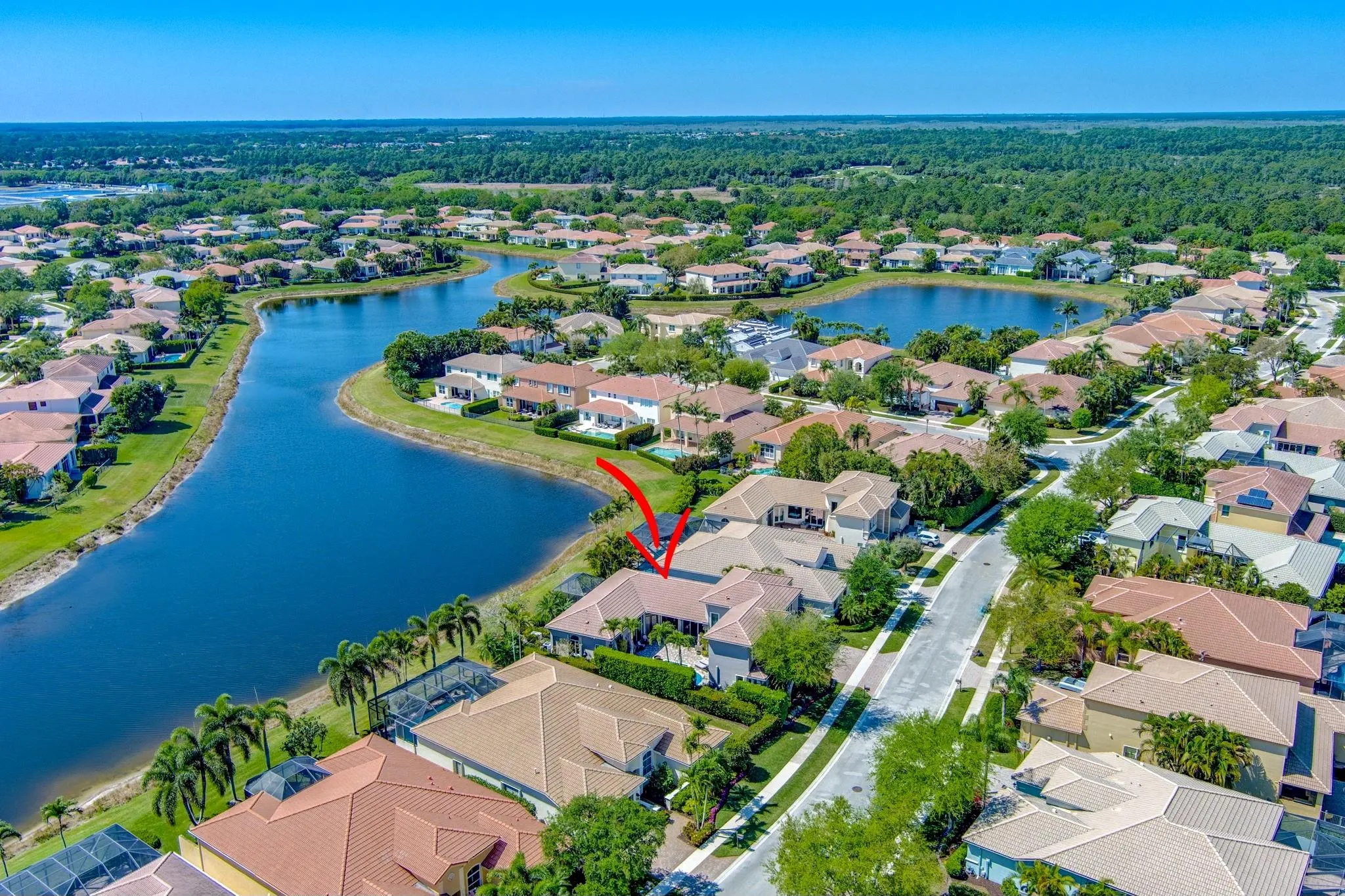 Buyer’s financing fell through, so this spectacular home is back on the market. Everything works out as itrnshould! RARE OPPORTUNITY TO PURCHASE THIS BEAUTIFUL HOME AT A FANTASTIC PRICE. You will step into a Garden Of Eden as you enter the Courtyard of this highly sought after Verona Model, located on an incredible well-manicured lakefront lot in the private gated community of Mirabella at Mirasol . Desirable features of this 5 BR ,4.5 Bath brightly lit dream home include soaring volume ceilings , tiled flooring throughout living area ,custom light fixtures ,spectacular landscaping ,a detached guest house, updated kitchen with Quartzite counters ,and stainless steal appliances, a large pool with waterfall, screened in lanai overlooking wide lake views, Full House Generator