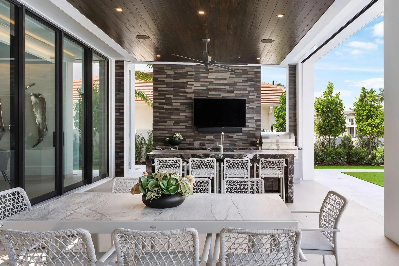 Discover a brand-new smart home crafted by Hanna Homes within the prestigious Royal Palm Yacht & Country Club! This custom estate is offered turn-key and fully furnished by Brown Interiors Design Group. With 6-bedrooms spanning over 9,500 square feet of luxurious living space, it seamlessly blends grandeur with the comfort of waterfront living. The property’s centerpiece is a resort-style pool with a spa and sun shelf. The pool is complemented by an expansive covered loggia featuring a summer room and a fully equipped outdoor kitchen, perfect for entertaining or serene relaxation. Every element of this home is crafted for ultimate refinement, from the fully automated Crestron smart-home system to the state-of-the-art security features.