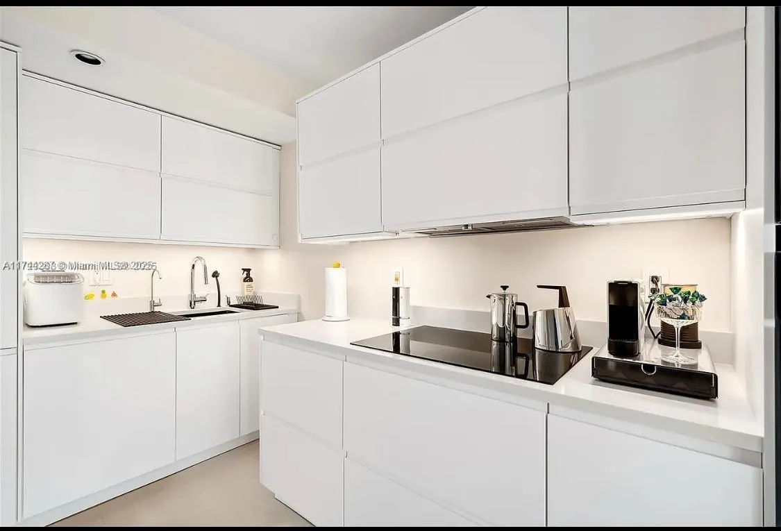 One bedroom two bathrooms apartment with the den that can be used as a guest bedroom or office. Top floor/penthouse. Beautiful panoramic view of the new, modern 18-hole golf course by Greg Norman. Quiet location. Complete modern designer renovation in 2022 with the permits. Everything is new including layout, ceilings, walls, floors, pipes, air ducts, wiring, switches and sockets, heat/noise/hydro insulation, high impact windows and balcony door. Balcony screened enclosure, AC 2012 in good condition. Unit is being sold with all appliances, furniture and accessories. The buildings have a heated swimming pool and a gym with a beautiful view of the bay, sauna, and a game room with billiards. Walking distance to Hollywood and Hallandale beaches. 5-10 minutes’ walk to shops, restaurants, etc.