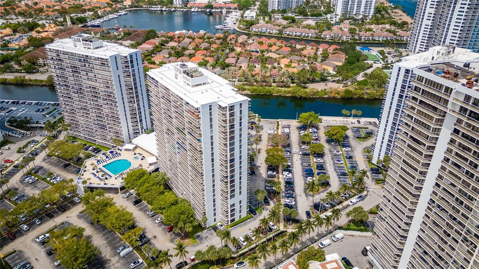Soaring from the 19th floor, this 3-bed, 3-bath condo offers stunning golf and city views in a bright, open layout. With 1,465 sqft of tile-floored living space, the home features a well-equipped kitchen with an electric range, microwave, refrigerator, washer, and dryer in the unit. Enjoy morning coffee or sunset wine on the spacious open balcony. Central cooling and ceiling fans ensure year-round comfort, while a doorman provides added security. The waterfront building offers assigned and guest parking, blending convenience with elevated living. This high-rise retreat is perfect for those seeking comfort, style, and serene views in every direction.