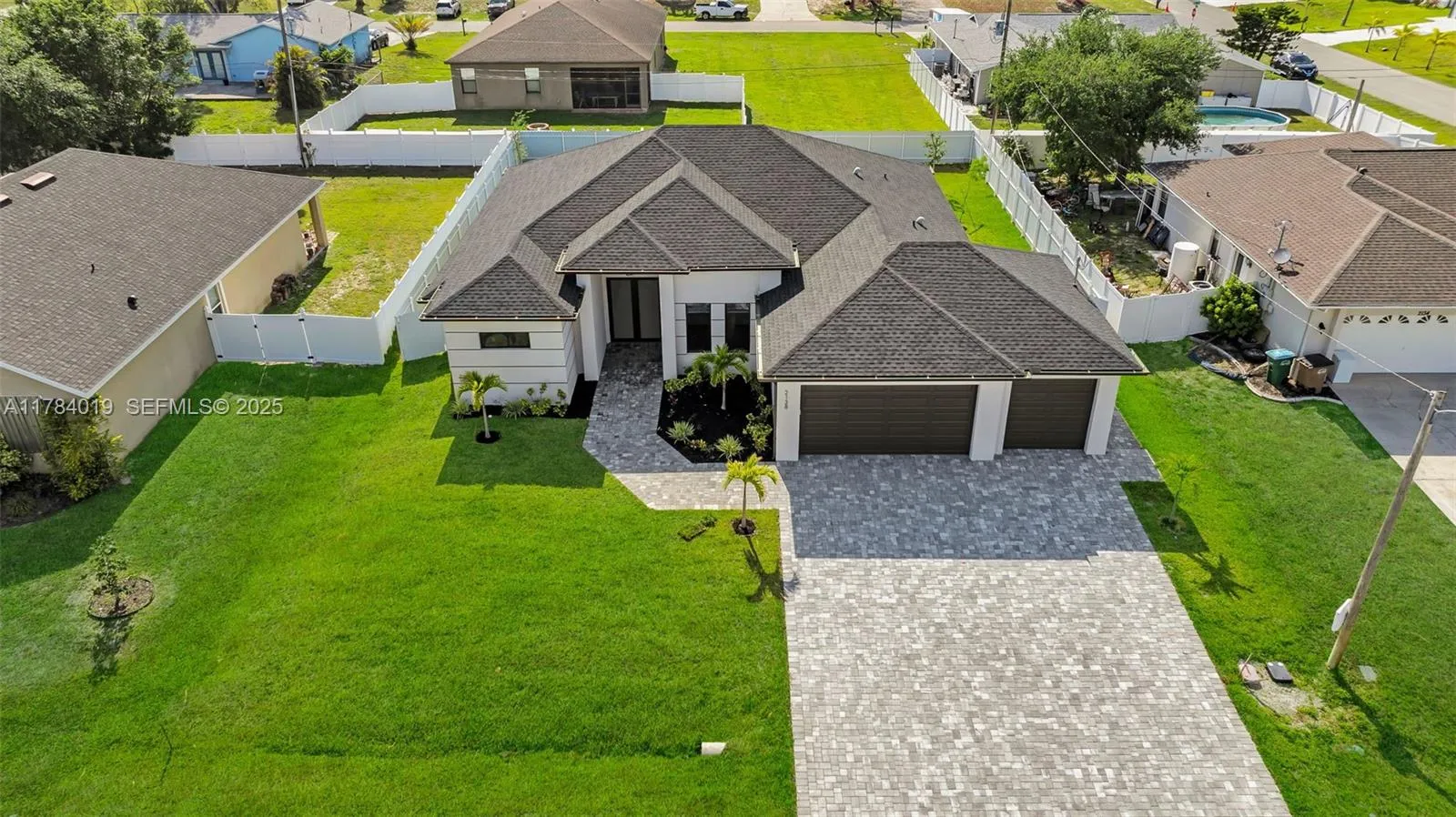 NO FLOOD ZONE – CITY WATER ASSESSMENT ONLY $2,300 (PAID BY BUILDER!)rnrnStunning new construction 3 BR + Den / 3 BA / 3-Car Garage. Den can serve as 4th BR, office, or playroom. All-tile flooring. East-facing front, west-facing back for gorgeous sunsets.rnrnFeatures include:rnrnHigh ceilings & open layoutrnrnModern kitchen w/ quartz counters, backsplash, built-in oven & microwavernrnWalk-in pantry w/ built-ins + spacious laundryrnrnPrimary suite w/ double shower, soaking tub, dual vanities & his/her custom closetsrnrnExtended paver pool deck w/ outdoor cooking arearnrnPrime location near Veterans Pkwy & Santa Barbara Blvd (close to Lowe’s, Target, Publix). CO Ready!