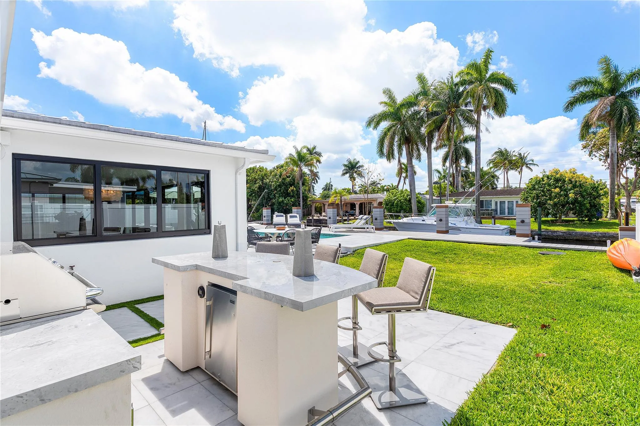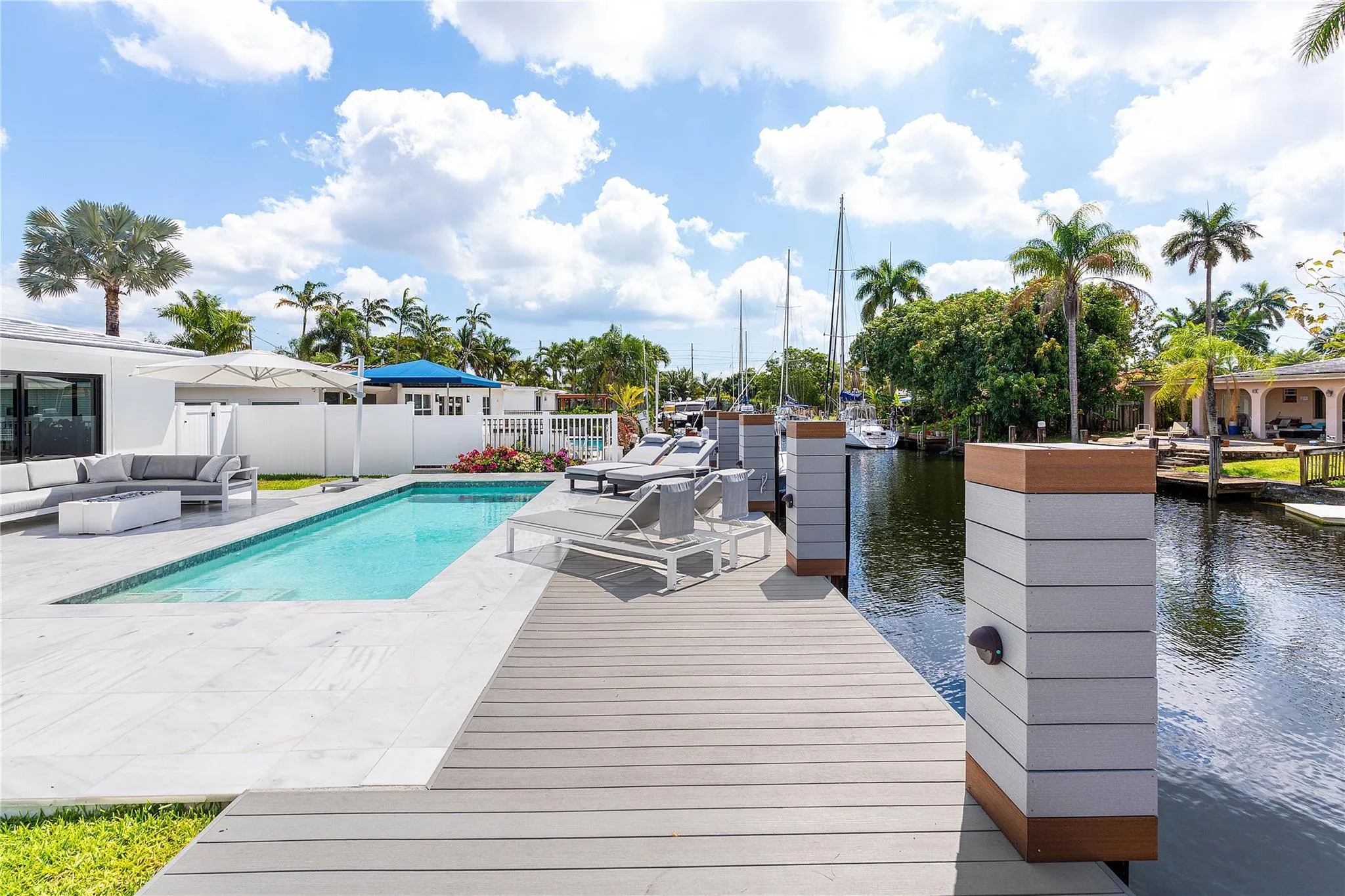 Remodeled Waterfront Pool Home w/65′ Waterfront & No Fixed Bridges+oversized 2-Car Garage. rnThis turnkey residence has been remodeled & thoughtfully designed for comfort, style, & functionality. Raised & reinforced seawall with new pilings, 50A electric, oversized composite deck with step-down area. Impact windows & doors throughout, new flooring & high-end finishes. Spacious oversized laundry & storage area, rare oversized 2-car garage, ideal for storage, toys, or a workshop. The backyard is your own private oasis with a newly built(2023) BBQ area, state-of-the-art heated pool(2023) & ample space for entertaining or relaxing under the South Florida sun. Nearby attractions; Intracoastal, beaches, top-rated schools, dining, & downtown Ft Lauderdale/Las Olas.
