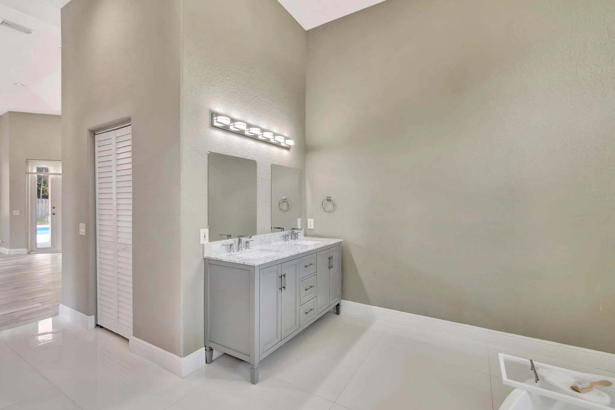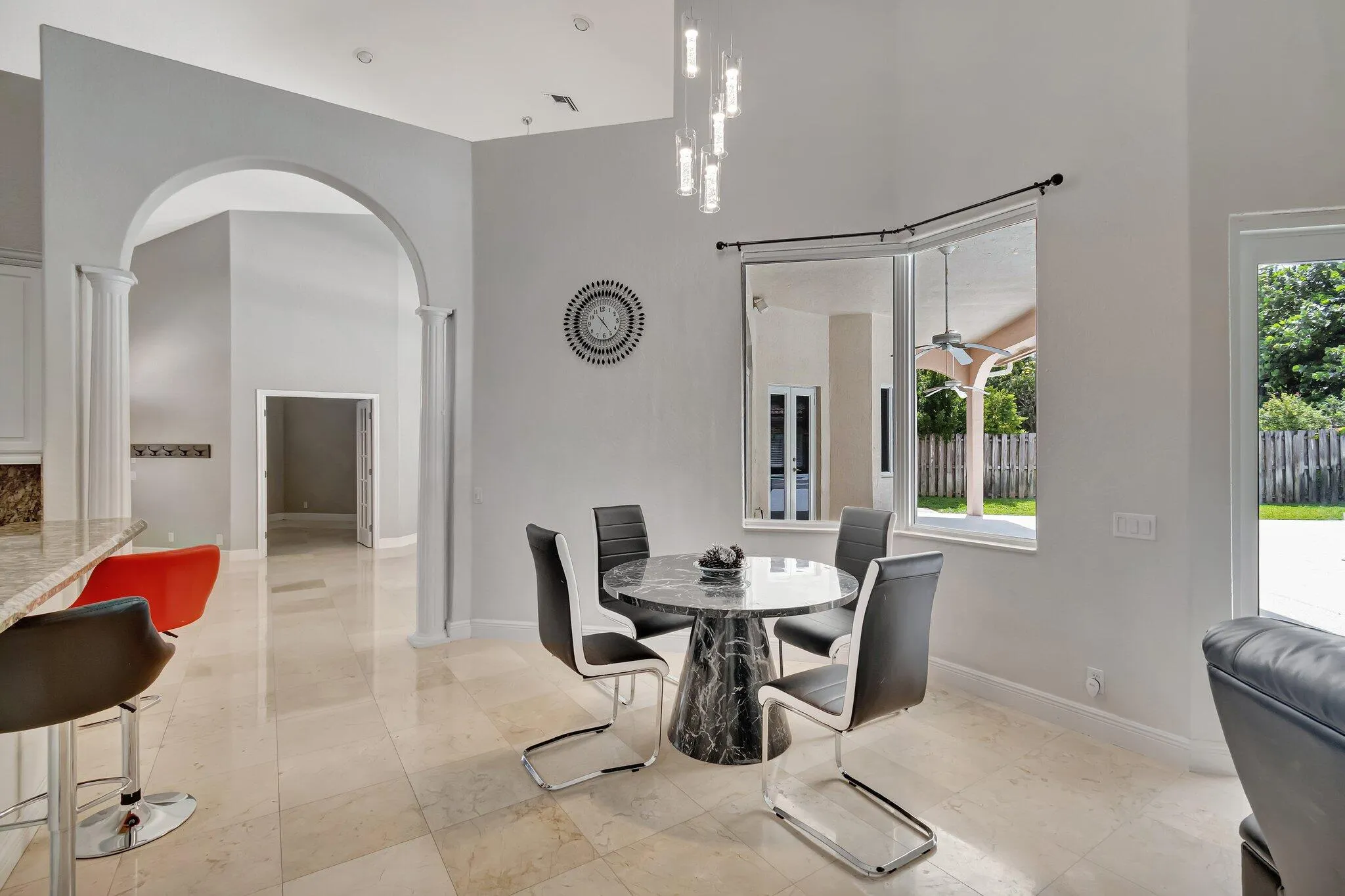 INDOOR-OUTDOOR LIVING at its finest! IMPACT GLASS, soaring ceilings, marble floors, and an oversized 39 x 17 LAP POOL with spa define this remodeled cul-de-sac retreat. Ideally set on a large lot with mature landscaping in back for privacy and endless potential to create your dream tropical oasis. Nestled on a quiet cul-de-sac, this property offers a seamless flow between indoor and outdoor living. Light up the tiki torches and enjoy ”alfresco dining” under the expansive covered patio–perfect for entertaining or relaxing, with plenty of green space for your four-legged friends. The oversized driveway, spacious front porch, and grand architectural columns create instant curb appeal.